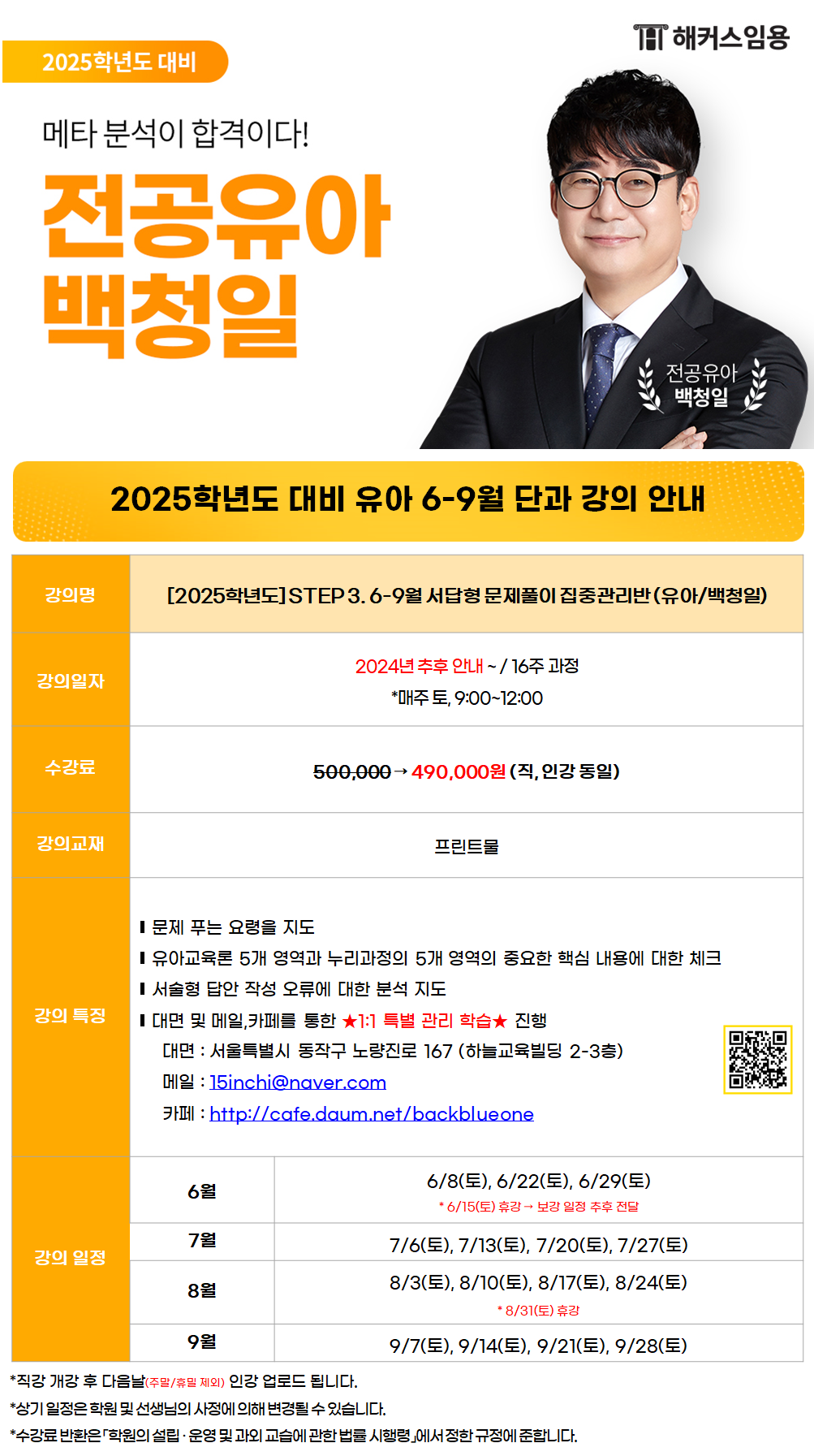 [백청일 유아]★6-9월 서답형 문제풀이 집중관리반 강의 안내![내용수정:6.7] 작성자해커스임용|작성시간24.05.07|조회수15 목록 댓글 0 글자크기 작게가 글자크기 크게가 다음검색 현재 게시글 추가 기능 열기 북마크 공유하기 신고 센터로 신고 댓글 댓글 0 댓글쓰기 답글쓰기 댓글 리스트