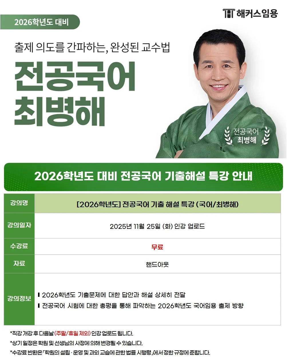 [최병해 전공국어] 2026학년도 전공국어 1차 기출해설 특강 - 11/25(화) 공개 작성자해커스임용.|작성시간25.11.25|조회수90 목록 댓글 0 글자크기 작게가 글자크기 크게가 다음검색 현재 게시글 추가 기능 열기 북마크 공유하기 신고 센터로 신고 댓글 댓글 0 댓글쓰기 답글쓰기 댓글 리스트