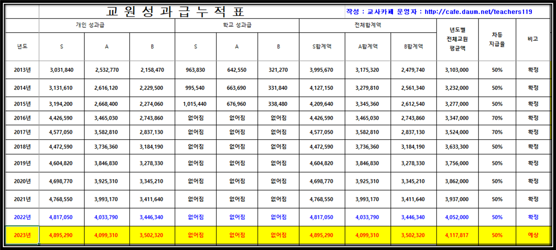 오늘 2022년 성과급이 지급 확정되었으니 항상 앞서가는 교사카페에서는 이젠 2023년도의 성과급 예상 금액을 알려 드려야 겠네요. ㅎㅎ