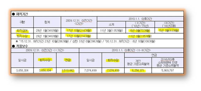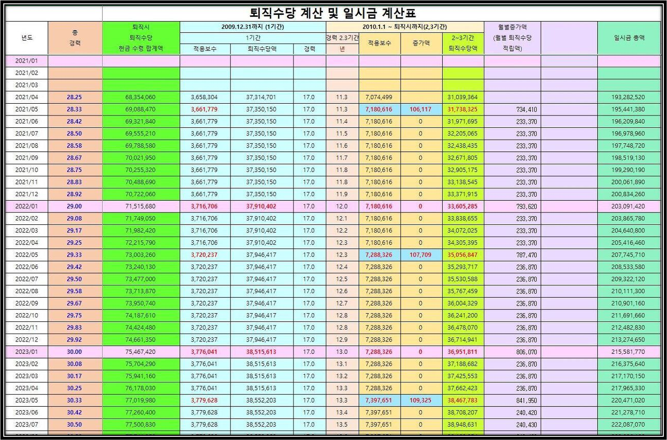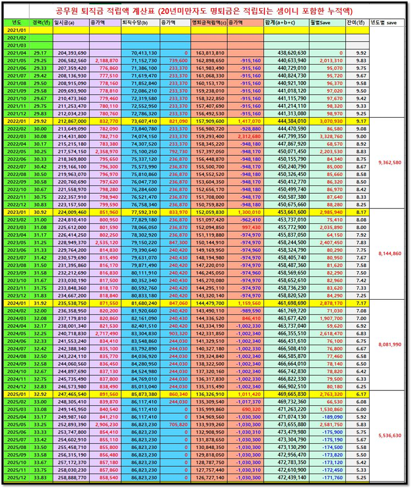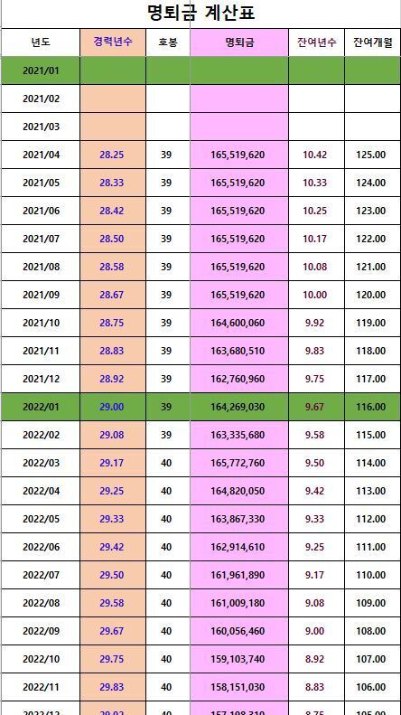 6) 퇴직시까지 자신의 경력이 증가시마다 년도별 월별로 적립된 명퇴금 계산표가 제공됩니다.