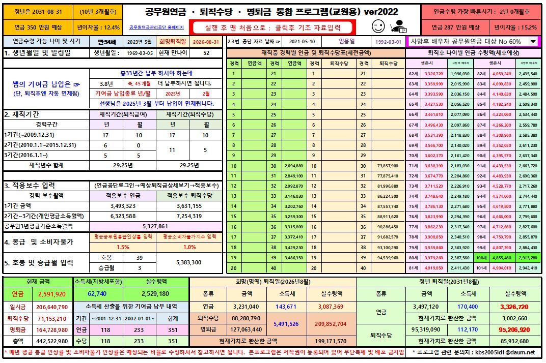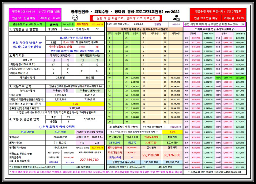 통합프로그램을 한번도 사용해 보지 않으신 초보자분들도 아주 쉽게 사용하실 수 있도록 사용법이 대폭 개선되었고 본인 사망시 배우자에게 지급되는 유족연금란까지 추가되었습니다.