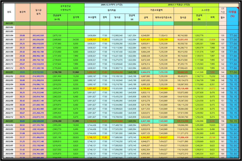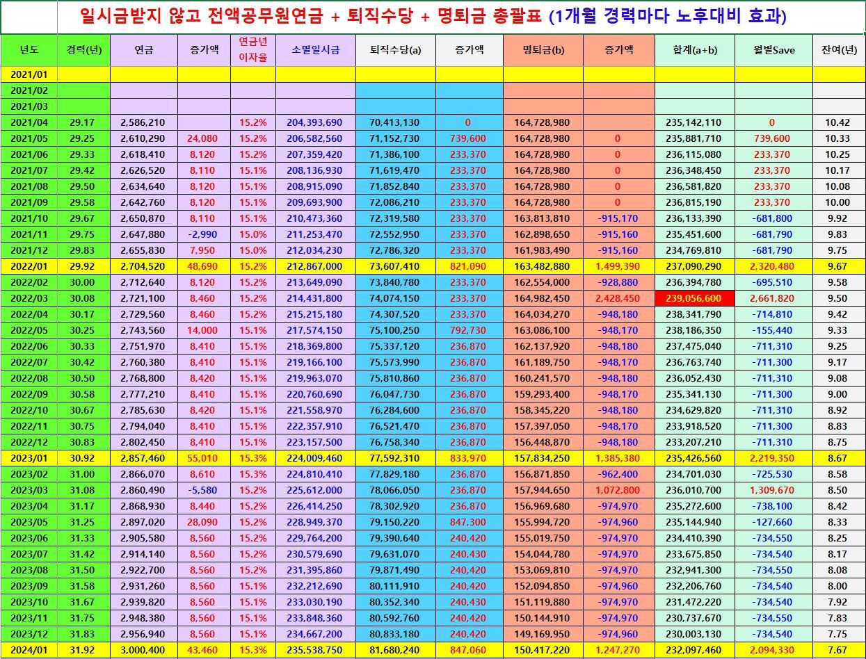 7) 1개월 경력마다 노후대비 효과표가 제공되며, 명퇴하실 생각이 계신분은 자신에게 가장 유리한 금액이 언제인지 아래 빨간색처럼 최대금액을 받을수 있는 시기도 알려 줍니다.
