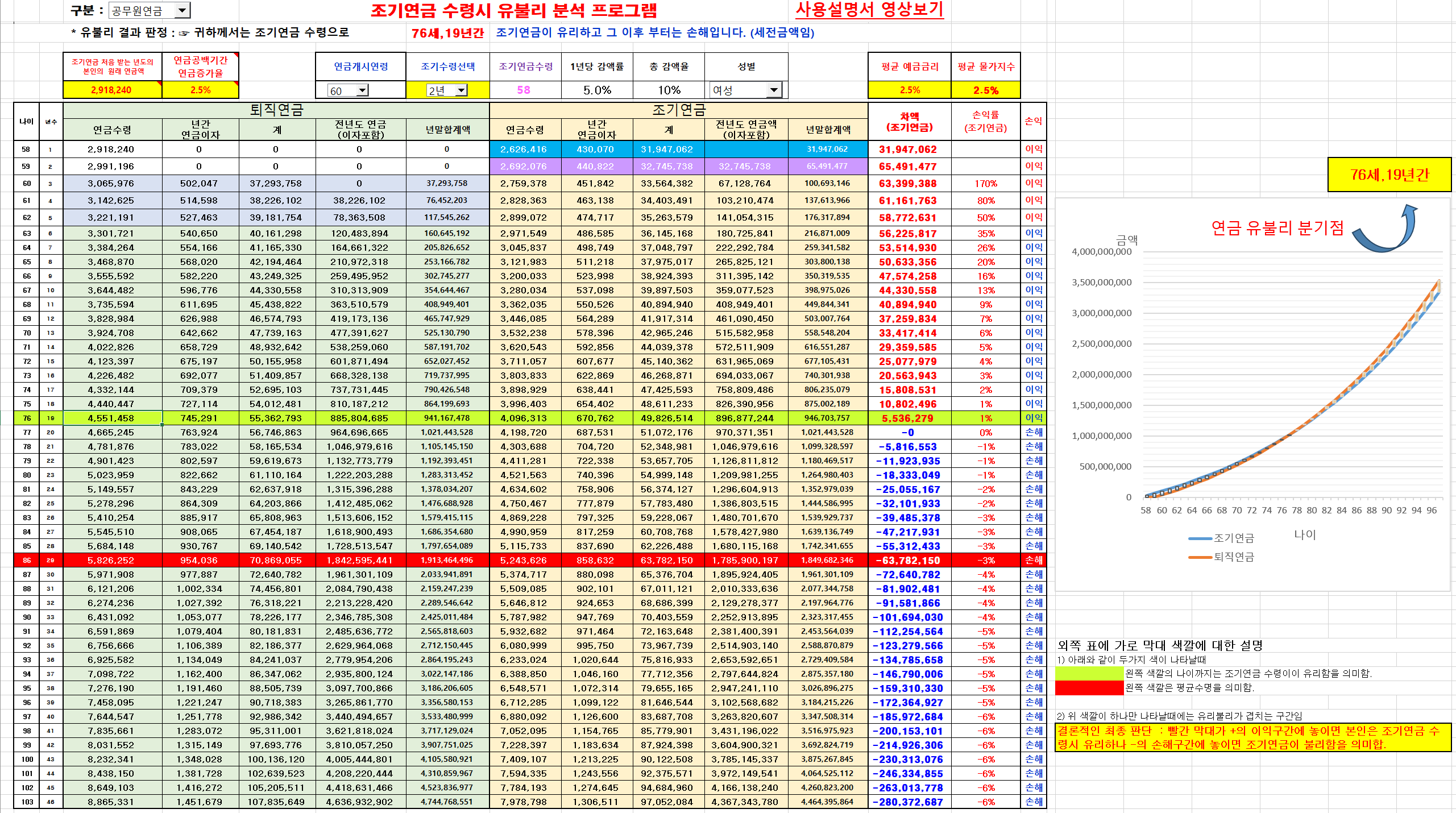본인이 언제 퇴직하던지 간에 자동으로 조기연금을 얼마나 수령할 있는지를 미리 알려 주는 조기연금 자동분석 프로그램이 아래와 같이 추가되어 언제 퇴직하던지 간에 조기연금을 얼마나 받을지에 대하여 고민을 해결해 드리도록 개선되어 2025년에 10,000원에 판매될 프로그램이 추가되었습니다.