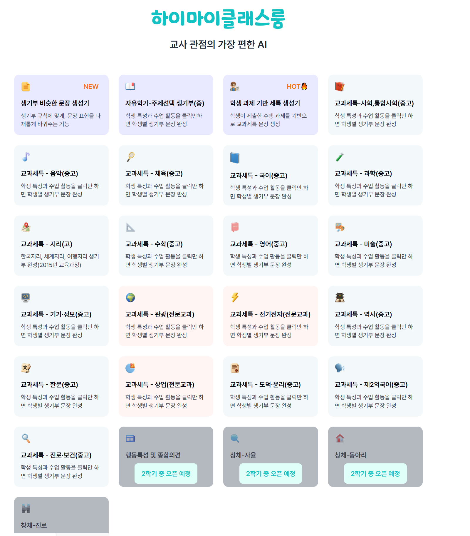 이번에 티처라인과 1년간 자매 결연을 맺어 선생님들께 하이마이 클래스룸의 교사 관점의 가장 편한 AI를 소개해 드립니다.