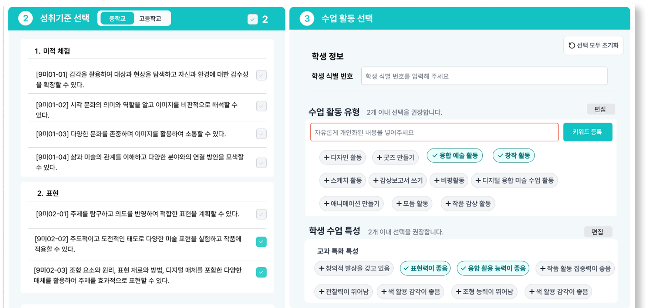 ✅ 교육과정 성취기준, 수업활동 유형, 학생 수업특성에 기반한 생기부 문장 생성