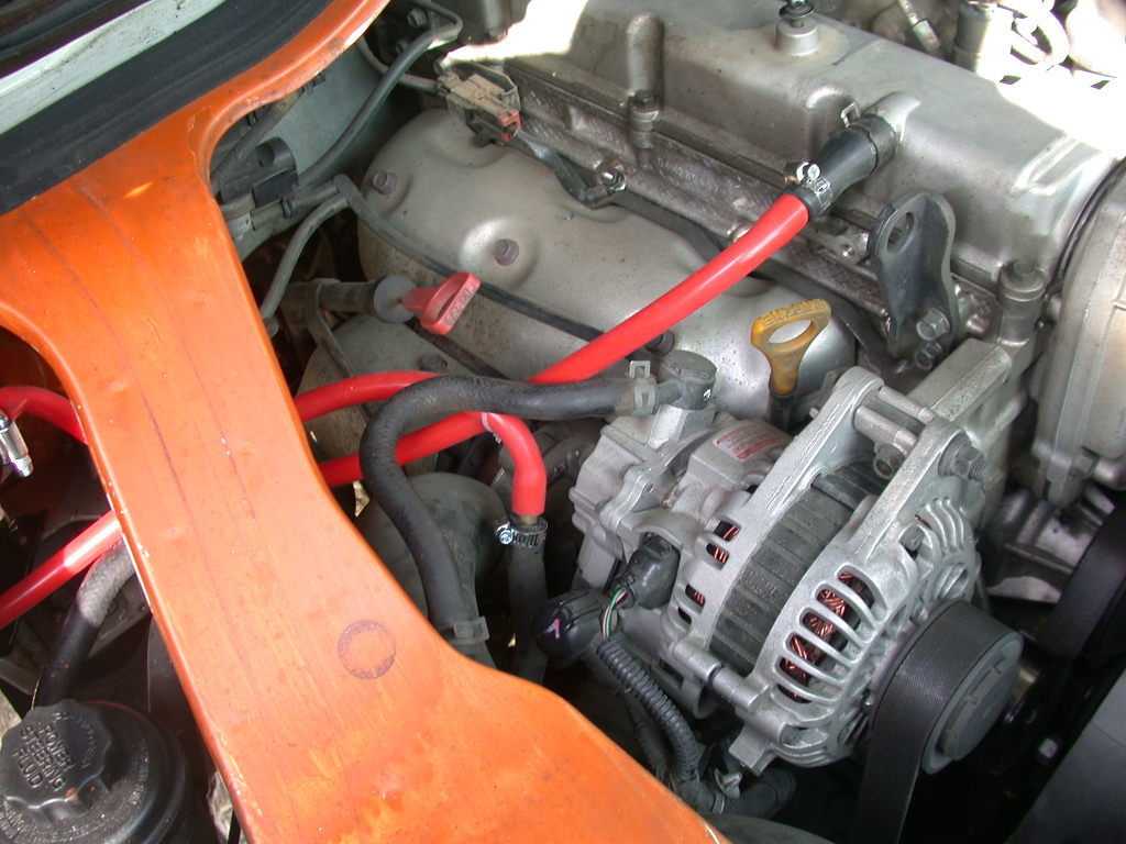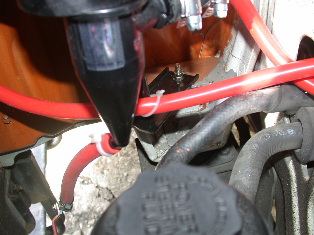 엔진룸에 장착한 사진입니다. 파워오일통 부분에 설치 했습니다. 브라켓은 ㄱ자 브라켓을 구했구요. 우선 구경을 맞추기 위해