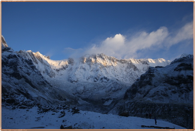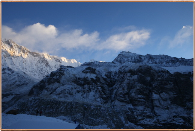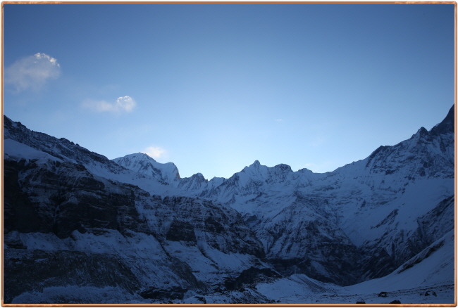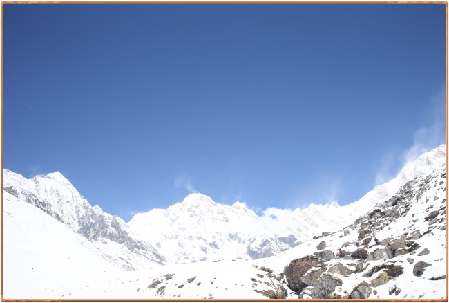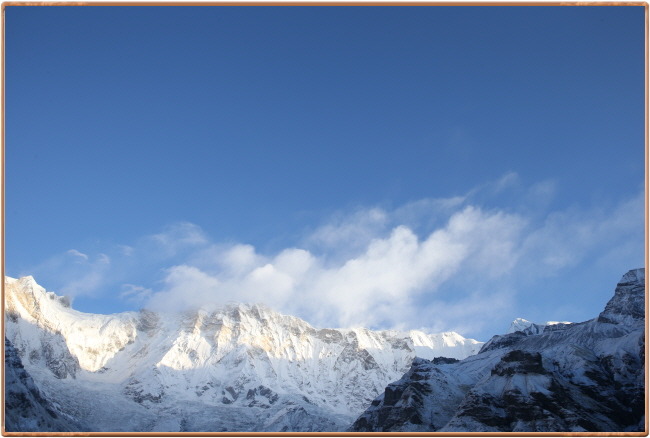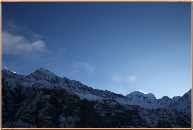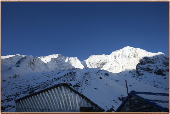 롯지에 아침이 옵니다. 설산은 새로운 빛으로 단장을 하면서 세상을 순백과 환한 빛으로 바꾸어 보이는 만상을 눈부시게 합니다. 대기는 티끌이라곤 섞이지 않아 푸르다기보다 우주의 블랙홀과 같은 끝없는 하늘을 보여주고 산봉우리의 바람이 만드는 하얀 구름은 그래서 더 돋보입니다.