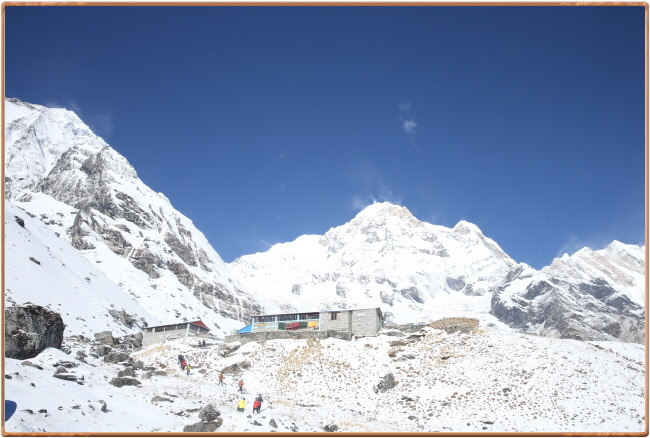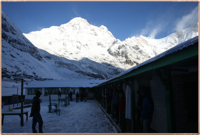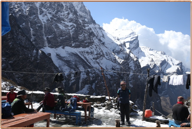 안나푸로나 베이스캠프 롯지를 뒤로 보내며