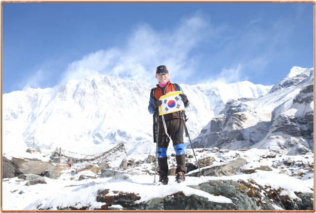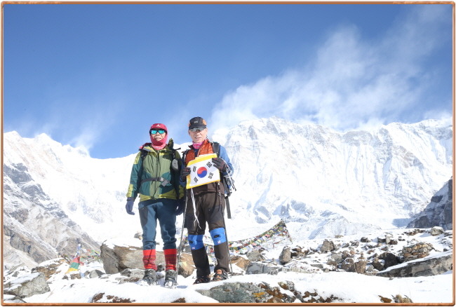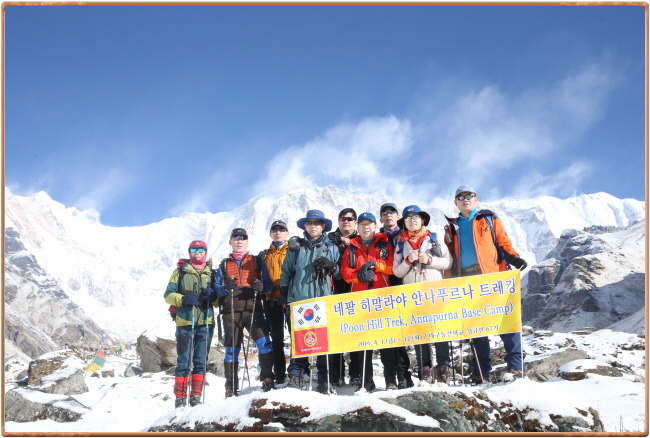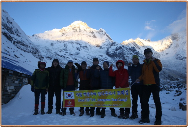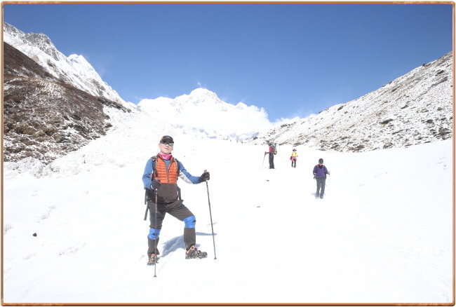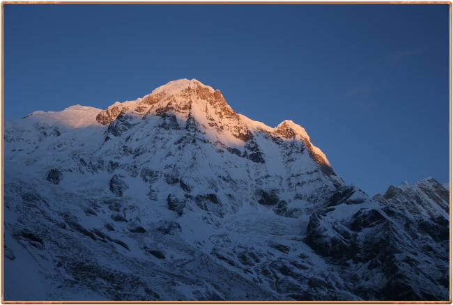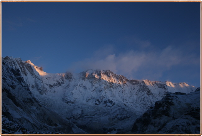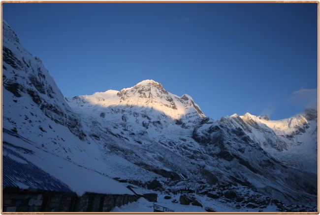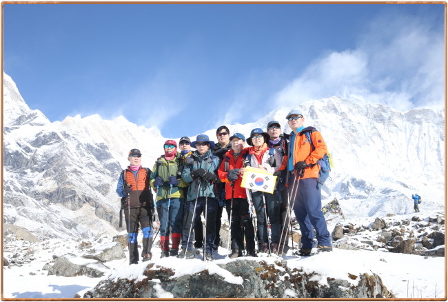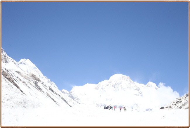 나는 몇번이고 잠이 깨 어설픈 롯지 침실의 성애로 얼어 붙은 창을 닦다보니, 새벽 1시 쯤 날씨의 변덕은 사라지고 별이 너무 가까이 다가와 있어서 추운 줄도 모르고 바깥으로 튀어나가 별에 안깁니다. 눈은 30여 센티미터가 쌓여 있는데 난 그 위에 옷도 빈약하게 입은 상태 그대로 별이 쏟아지는 하늘을 향해 눈밭에 누워봅니다. 별이 가슴으로 빛을 쏘아대니 나는 뜨거운 열기가 느껴져서 영하의 새벽 온도가 무색하도록 눈 밭에 있다가 침실로 기어오듯 들어와 다시 잠이 듭니다. 잠이 깬 베이스캠프의 일출은 우리를 황홀함에 가두어 말도 잃어버리고 움직임도 잃어 버린 하나의 조각상이 되어 버립니다. 무엇이 우리를 이토록 감동의 도가니로 몰아넣는지는 생각의 여지도 없이 '이자리에 서 보세요.' 라는 말 밖에 더 할 말을 잃어버립니다. 어쩌면 모든 세속의 것들을 일순이나마 티끌 하나 남기지 않고 버리고 스스로의 본연에 충실한 순간인지도 모릅니다. 나는 새벽의 쏟아지는 별과 지금 일출의 세상을 압도하는 아름다운 빛 속에 안겨 있음으로 땅에 서 있음을 잊어 버립니다. 히말라야는 그렇게 세상 사람들을 부르고 묵묵히 수억겁동안 처음처럼의 존재를 알리는듯 합니다. 우리네 세상도 그 처음의 본질을 이끌어 가면 얼마나 좋을까요.