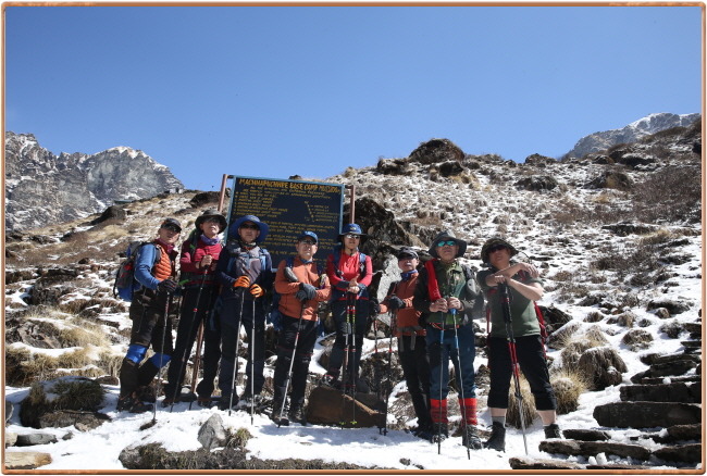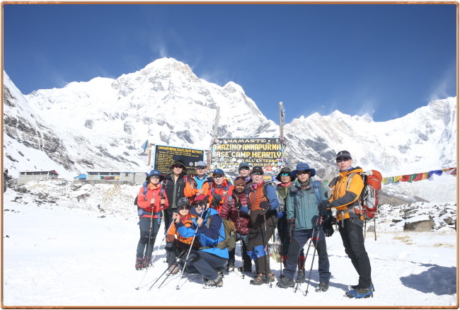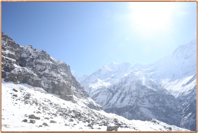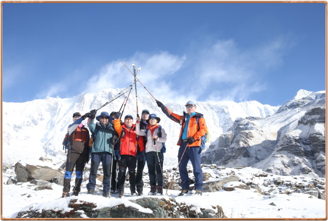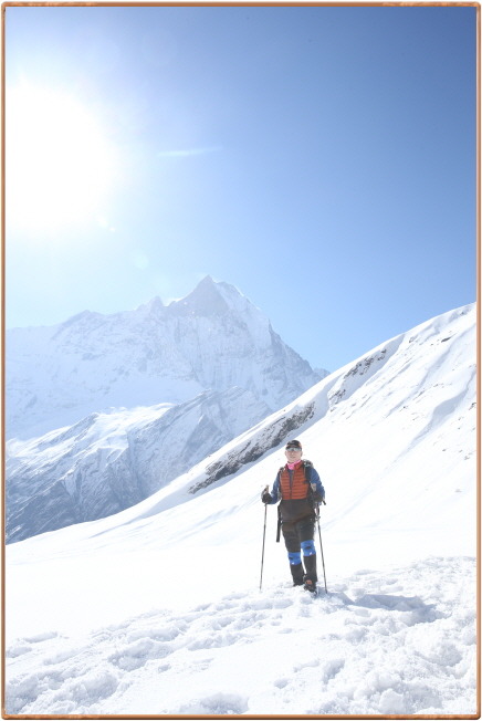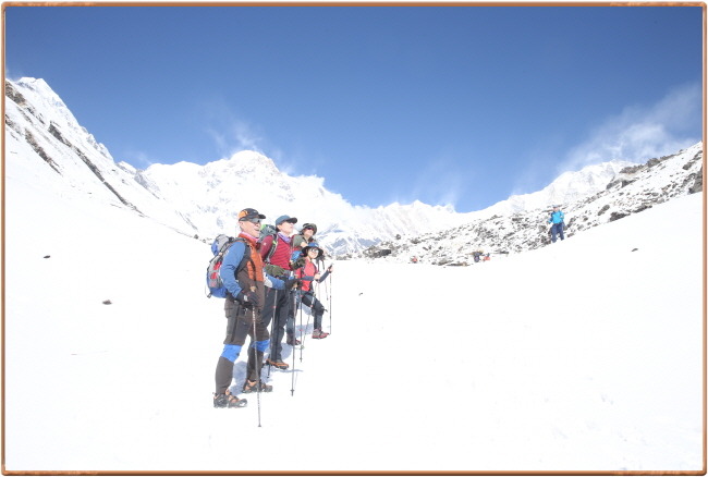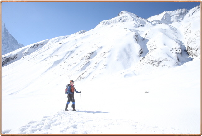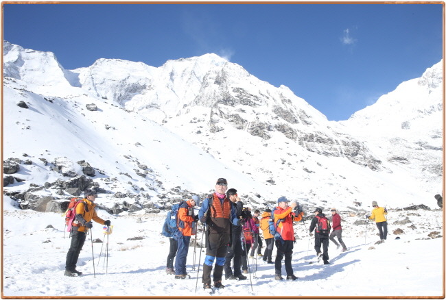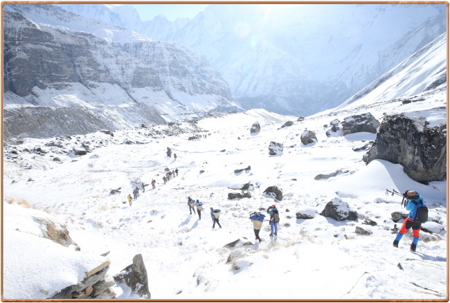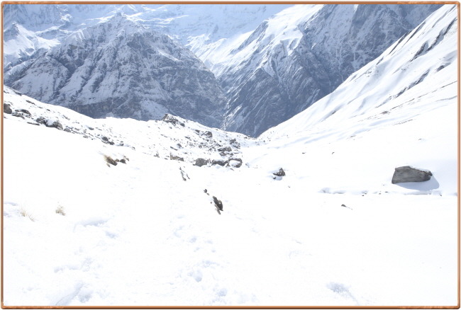 감동은 감동으로 남기고 산을 내립니다. 내일도 변함없는 히말라야겠지만 우리는 오늘의 히말라야를 간직하고 눈길을 내려옵니다. 간밤에 내린 눈이 온 천지를 흰색으로 덮어 세상은 온통 순백으로 눈이 부시고 우리네 움직임만 유일하게 색깔의 독특함을 보이는 것 같습니다. 그리고는 천상천하 유아독존이라고 하고 싶은게 속성인지 순백의 세상에서 떠나길 꺼립니다.