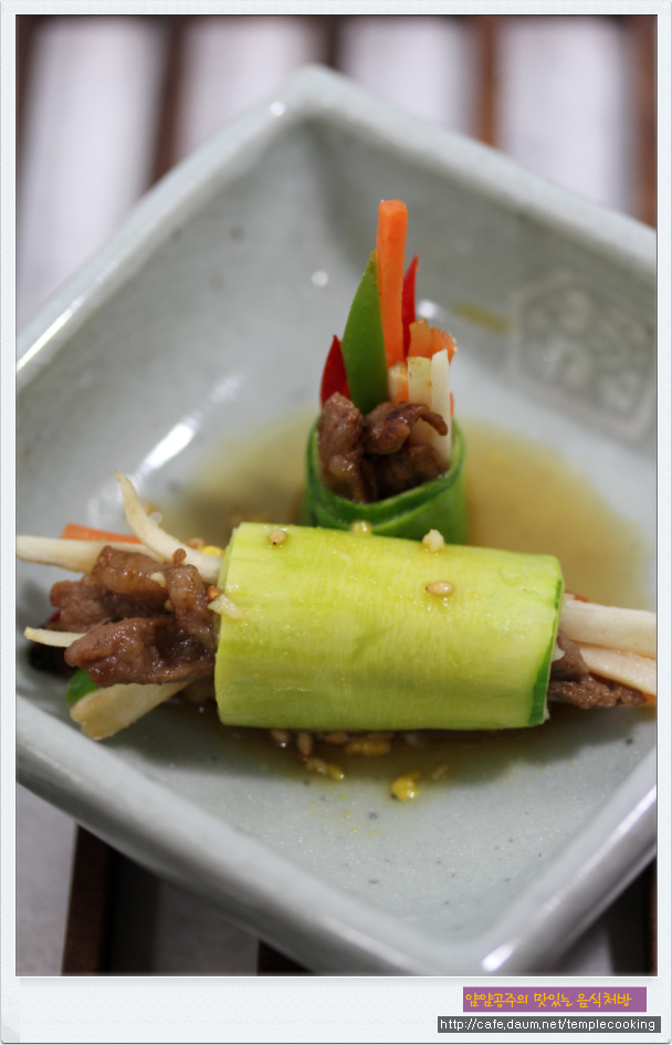 5. 절여진 애호박에 볶아진 소고기채와 애채를 넣어서 말아 준 후 끝 부분에 밀가루를 뭍혀서 말아준다