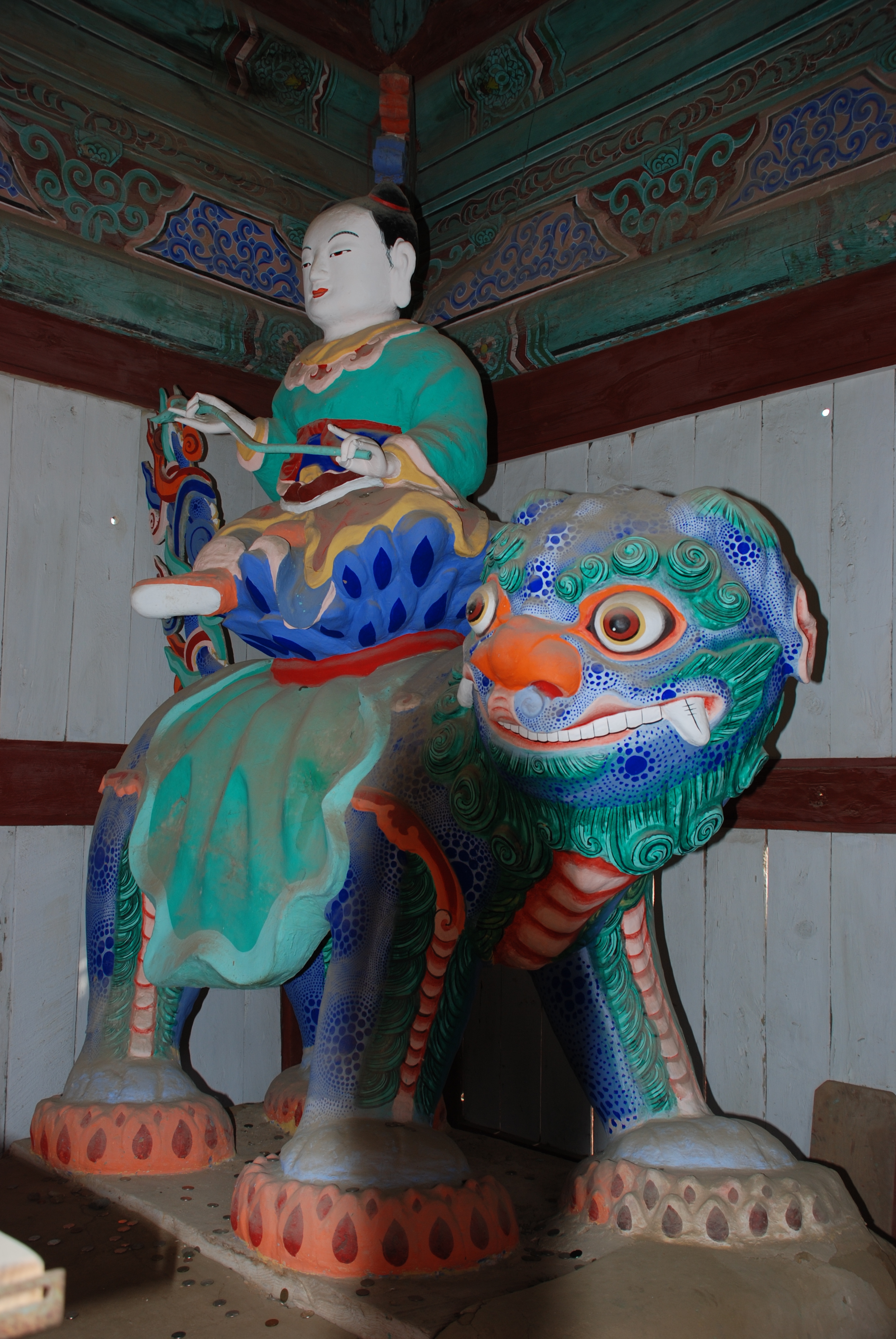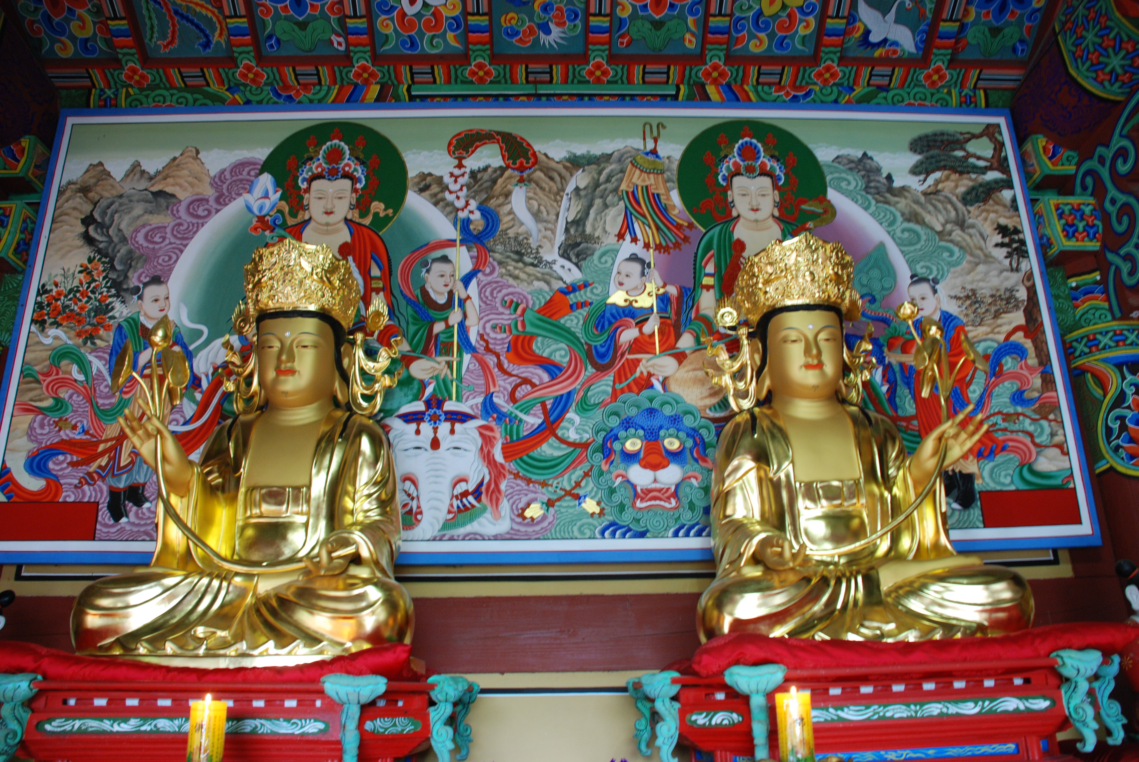 푸른 사자를 탄 문수보살과 하얀 코끼리를 탄 보현보살은 사찰의 산문[해탈문, 금강문] 등에서 볼 수 있습니다.