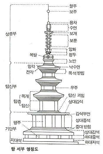 탑은 크게 기단부(基壇部), 탑신부(塔身部), 상륜부(相輪部) 세 부분으로 구성됩니다.