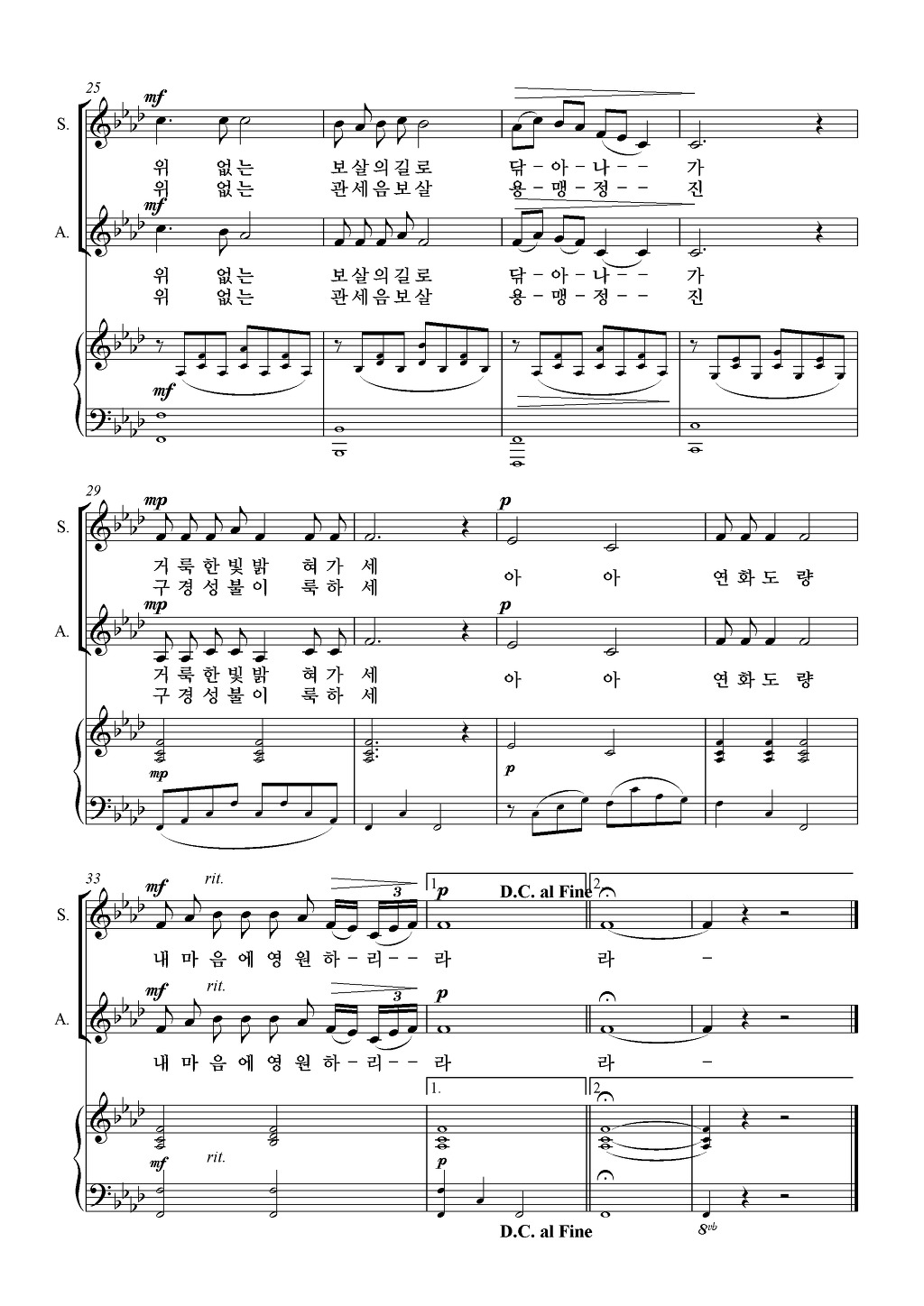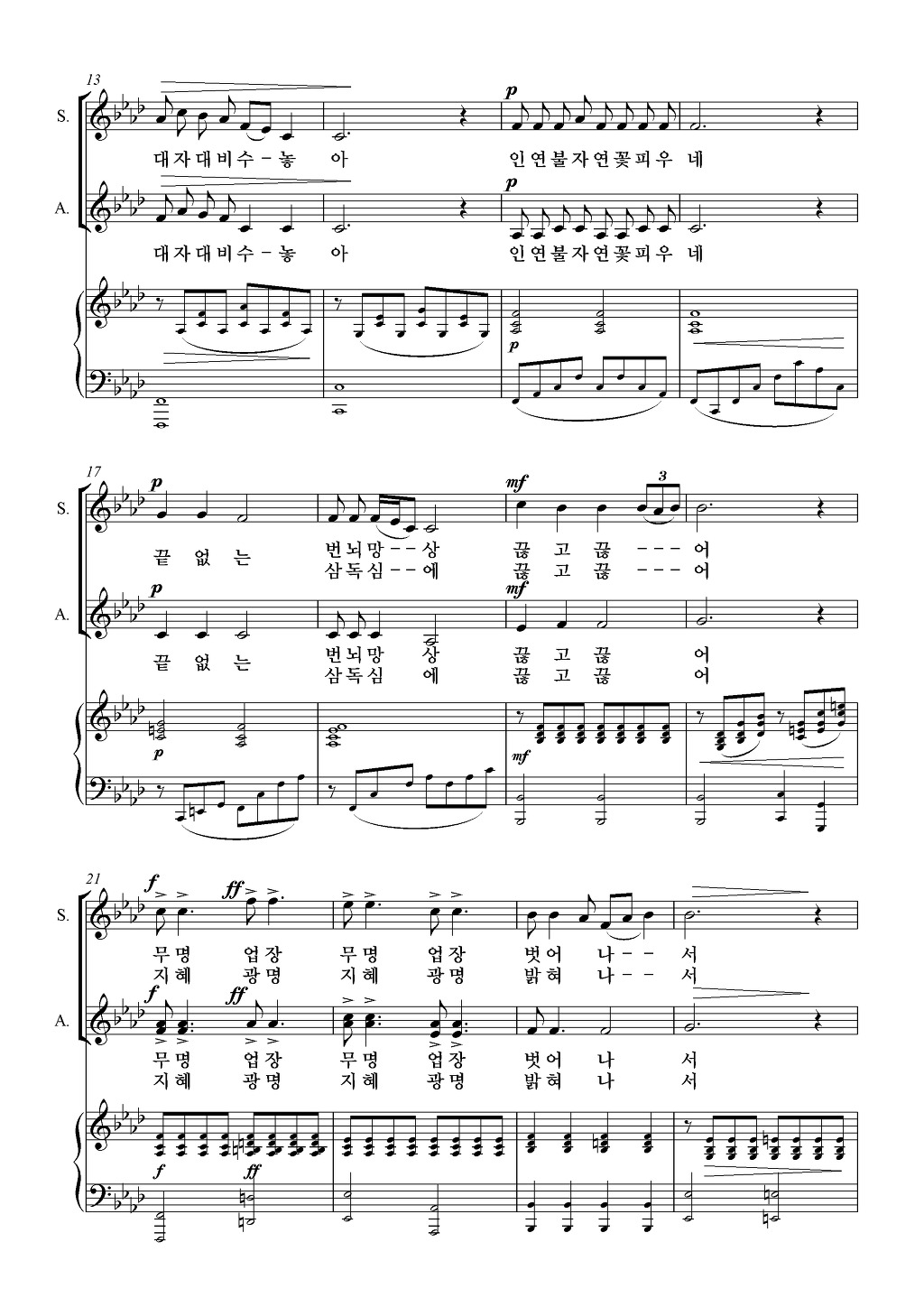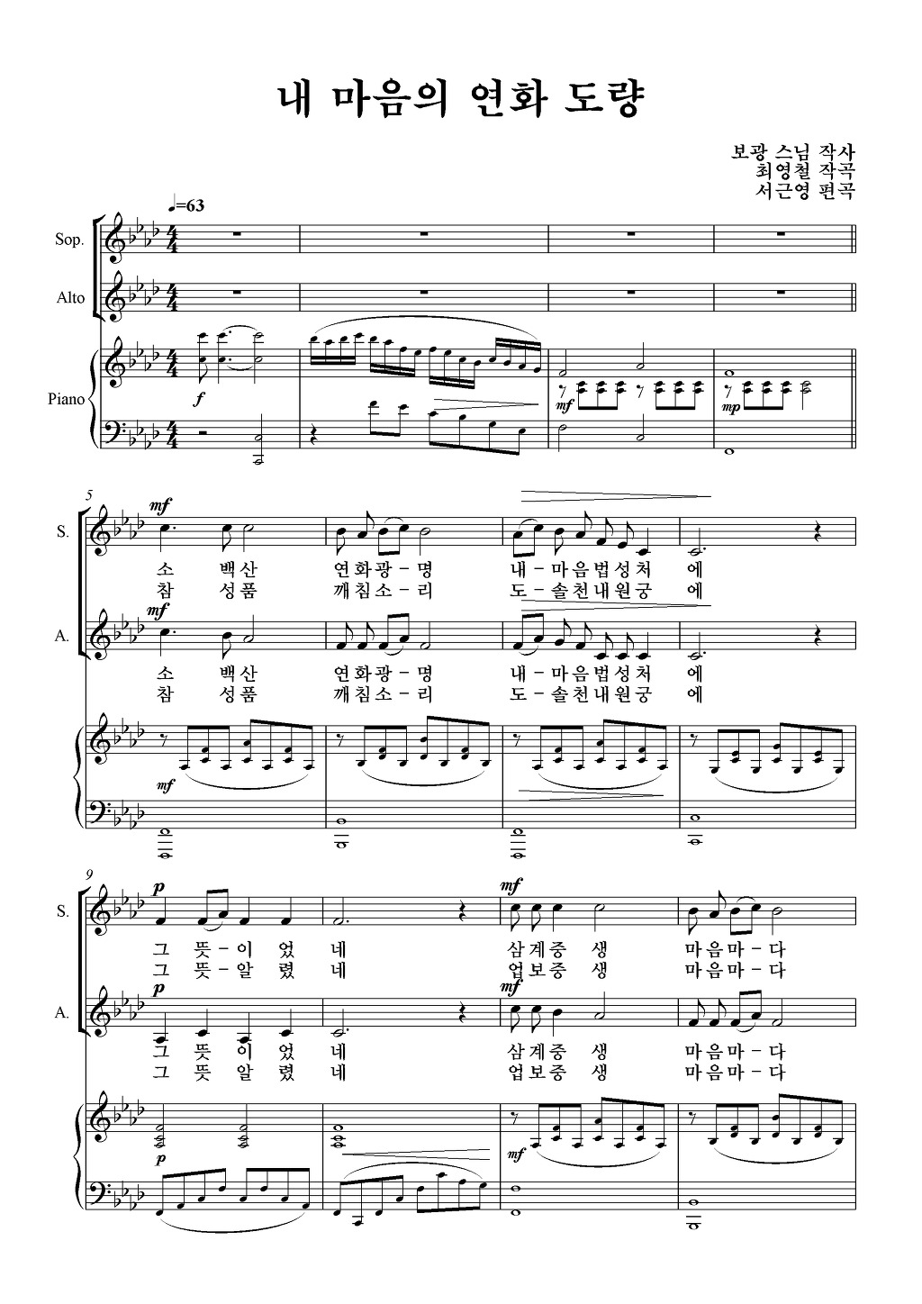 찬불가 "내 마음의 연화 도량" 작사 보광스님/작곡 최영철 작성자Maestro_한|작성시간13.07.24|조회수318 목록 댓글 3 글자크기 작게가 글자크기 크게가 찬불가 "내 마음에 연화 도량" 작사 보광스님/작곡 최영철 찬불가_내 마음의 연화 도량 (최영철 작곡).zip 첨부파일첨부된 파일이 4개 있습니다. zip 파일 찬불가_내 마음의 연화 도량 (최영철 작곡).zip jpg 파일 찬불가_내 마음의 연화 도량 (최영철 작곡)_001.jpg jpg 파일 찬불가_내 마음의 연화 도량 (최영철 작곡)_002.jpg jpg 파일 찬불가_내 마음의 연화 도량 (최영철 작곡)_003.jpg 다음검색 현재 게시글 추가 기능 열기 북마크 공유하기 신고 센터로 신고 댓글 댓글 3 댓글쓰기 답글쓰기 댓글 리스트 작성자서근영 | 작성시간 13.07.27 3페이지 27마디 가사 "나" 의 알토음을 시플랫에서 도로 바꿔주세요.3페이지 32마디 알토 "연화도량"을 소프라노 리듬과 같이 바꿔주세요. 작성자Maestro_한 작성자 본인 여부 작성자 | 작성시간 13.08.11 제목 내 마음에 연화도량을......내 마음의 연화도량으로 수정해야 함 작성자Maestro_한 작성자 본인 여부 작성자 | 작성시간 13.08.13 수정했습니다 댓글 전체보기