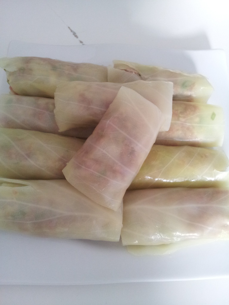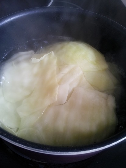 삶은 양배추를 찬물에 헹구어 물기를 뺀후 소고기양념한것을 넣고 이쁘게 싸준다.