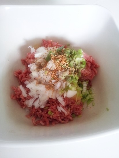 소고기 갈은 것과 양파를 잘게 다지고 파,마늘 ,후추, 깨소금, 참기름으로 머무려준디.