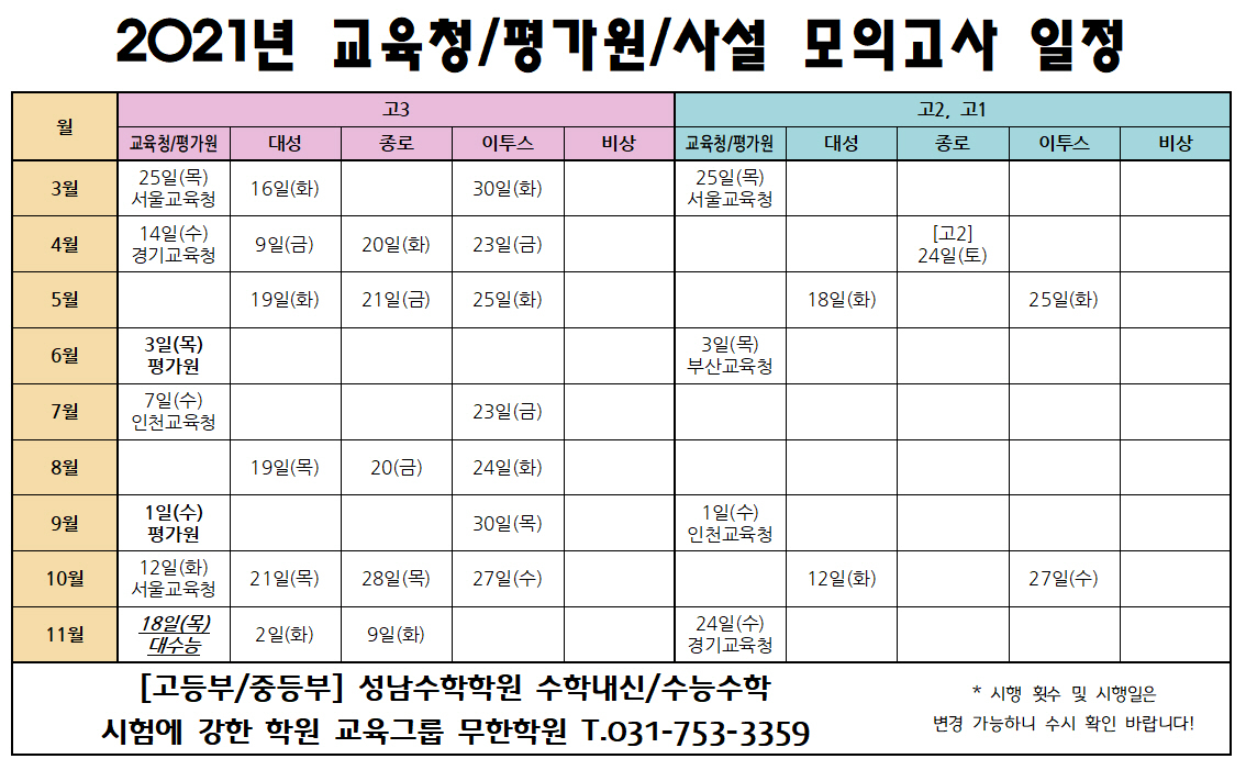 2021년 모의고사 일정 및 수능시험일