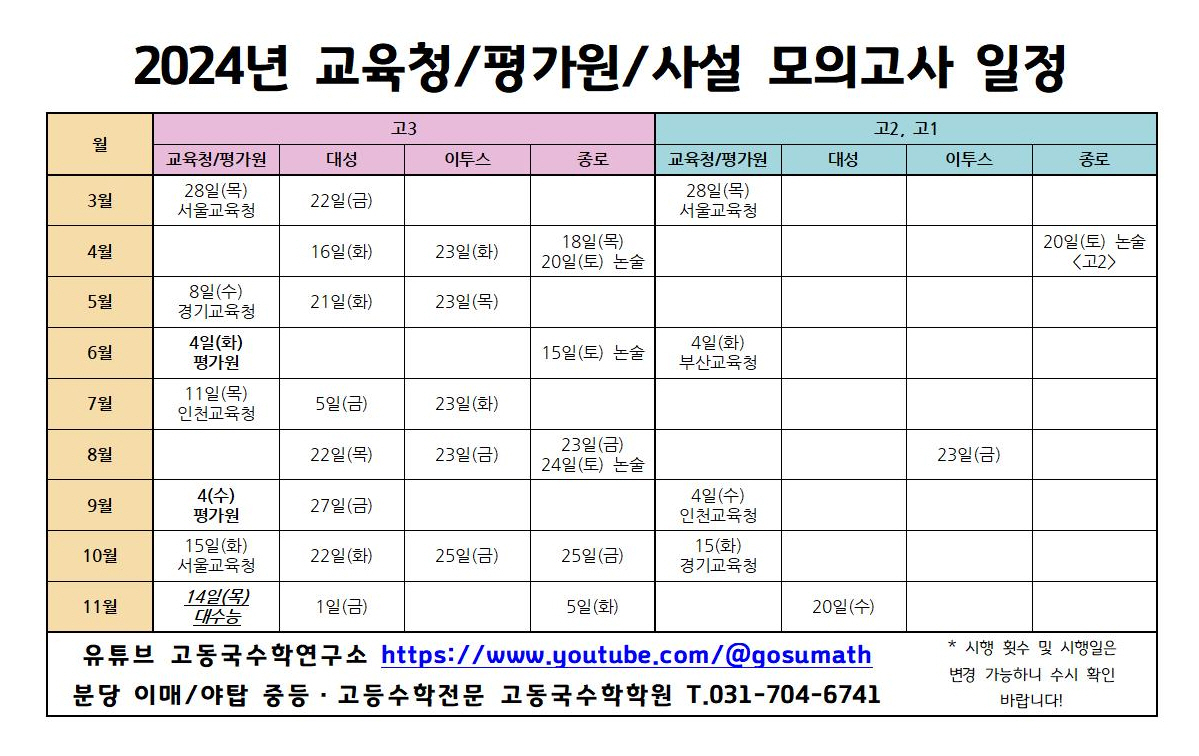 [분당 고동국수학학원] 2024년 모의고사 일정 & 2024년 모의고사 범위 - 평가원/교육청/(대성,이투스,종로) 포함