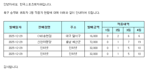 [적중결과]-축구 승무패 85회 ( 이월2회 1,001,119,250원 ) 작성자토순이네점빵|작성시간25.12.31|조회수351 목록 댓글 51 글자크기 작게가 글자크기 크게가 축구 승무패 85회차 적중결과.xlsx13.46KB 첨부파일첨부된 파일이 2개 있습니다. png 파일 image.png xlsx 파일 축구 승무패 85회차 적중결과.xlsx 다음검색 현재 게시글 추가 기능 열기 북마크 공유하기 신고 센터로 신고 댓글 댓글 51 댓글쓰기 답글쓰기 댓글 리스트 작성자무지개잉크 | 작성시간 26.01.02 감사합니다 작성자레이청하 | 작성시간 26.01.02 고맙습니다 작성자자유인 | 작성시간 26.01.02 감사합니다 작성자시몬 | 작성시간 26.01.03 자료 감사합니다~~ 작성자노다지복권방태평 | 작성시간 26.01.03 감사합니다. 댓글 전체보기