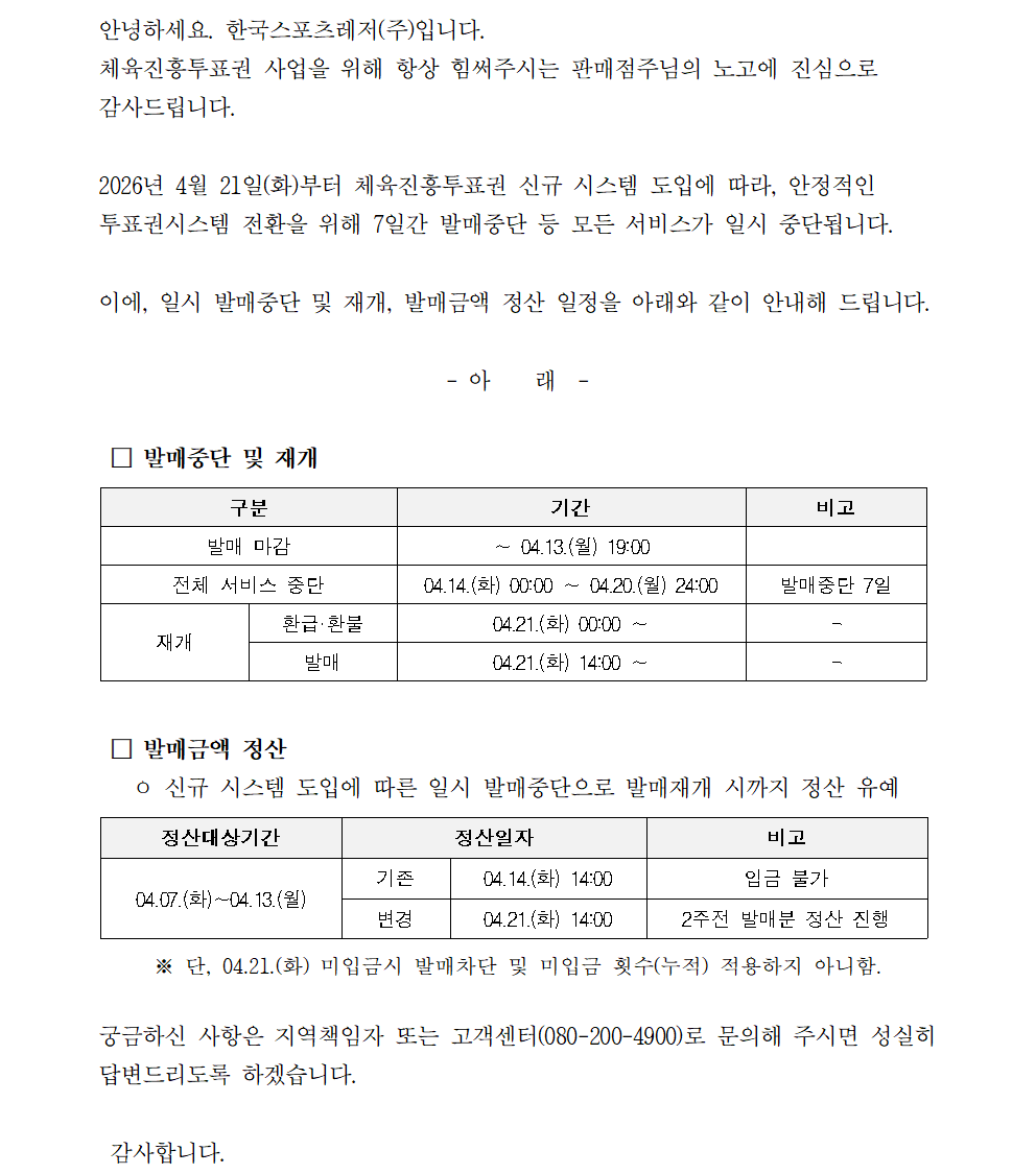 [안내] 신규 투표권시스템 도입에 따른 일시 발매중단 작성자돌구름|작성시간26.04.01|조회수1,515 목록 댓글 27 글자크기 작게가 글자크기 크게가 다음검색 현재 게시글 추가 기능 열기 북마크 공유하기 신고 센터로 신고 댓글 댓글 27 댓글쓰기 답글쓰기 댓글 리스트 작성자행운가득 | 작성시간 26.04.02 감사합니다 작성자다복이 | 작성시간 26.04.03 4월21일부터인지,, 4월13알 부터인지. 헷깔리네요 작성자해바라기 | 작성시간 26.04.03 감사합니다. 작성자승리맘 | 작성시간 26.04.06 정보 감사합니다 작성자강길동 | 작성시간 26.04.08 new 감사합니다 댓글 전체보기