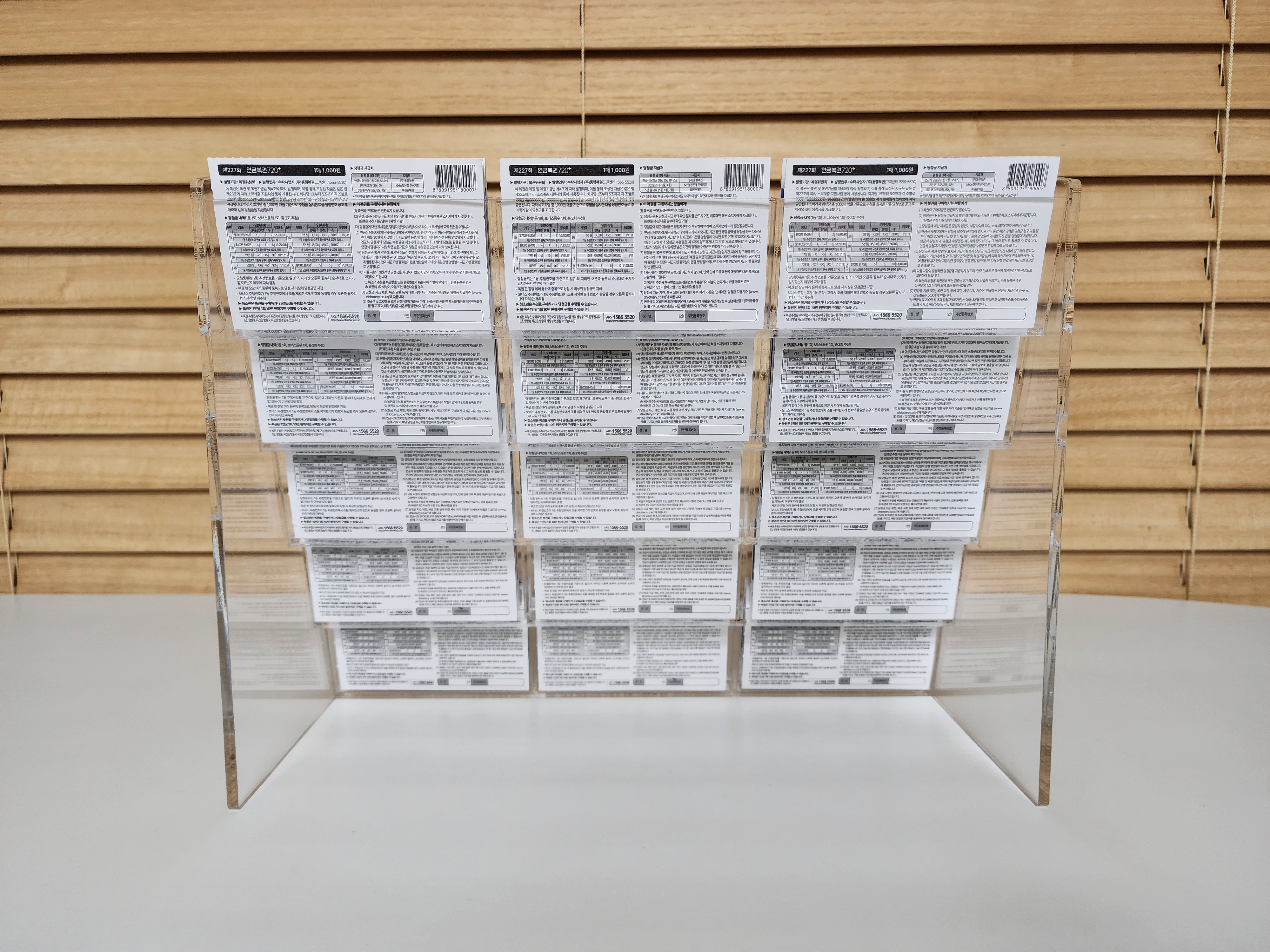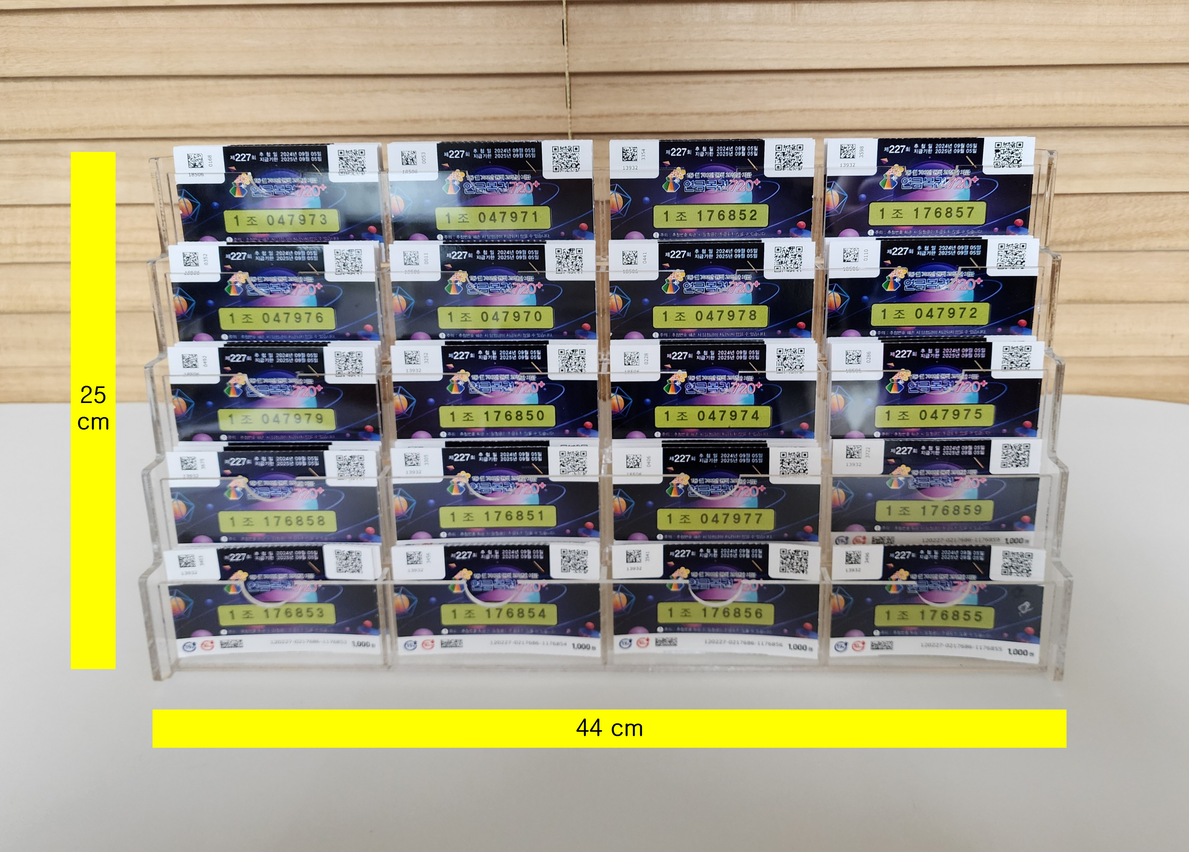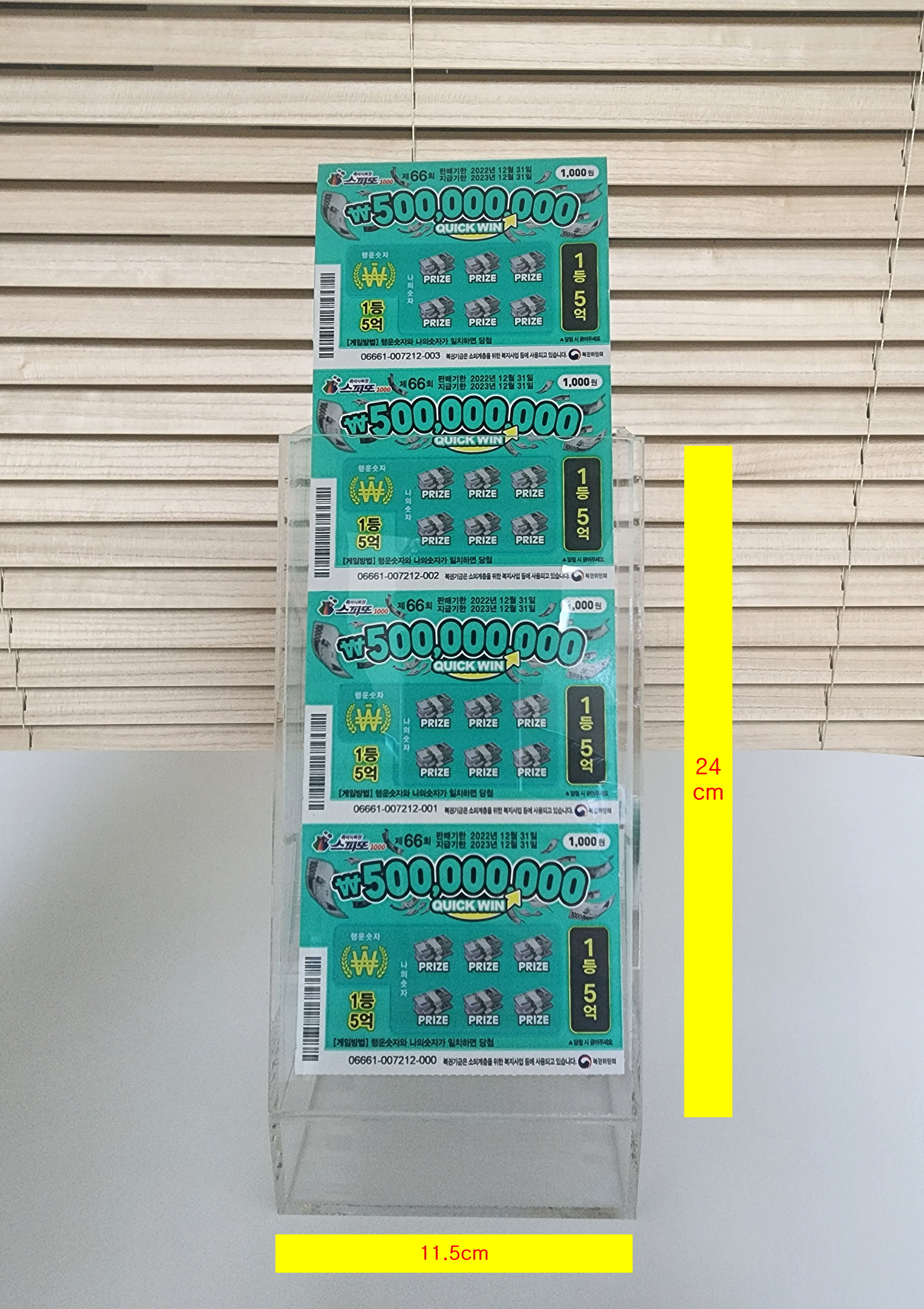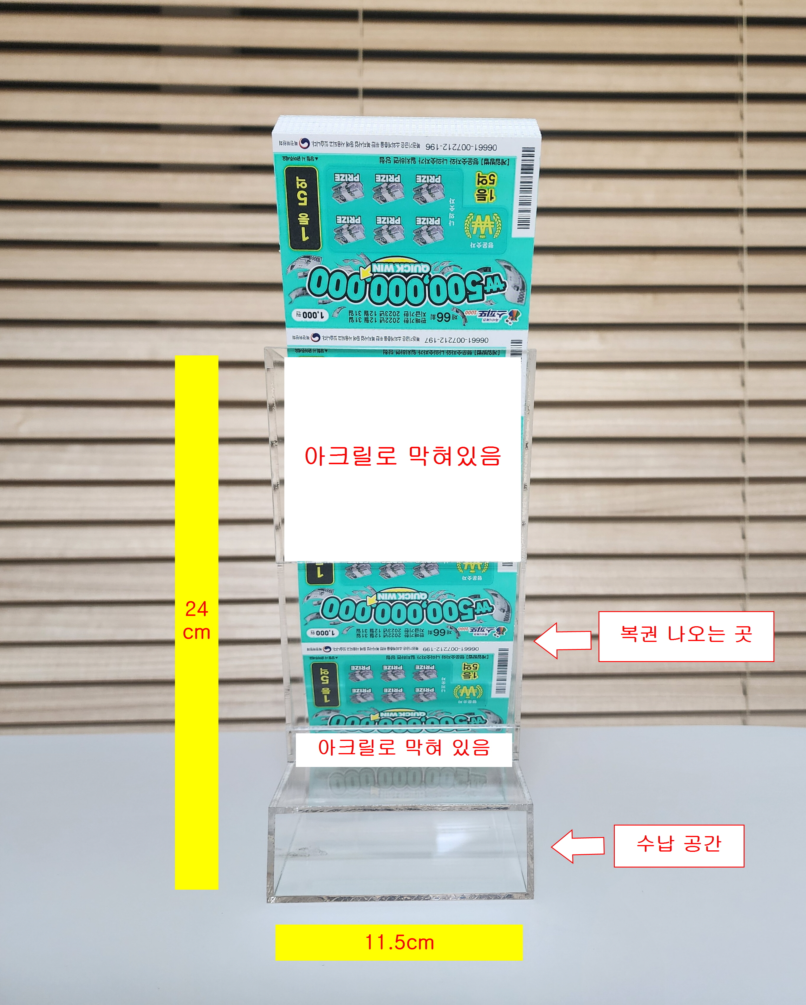 | 7번 - 즉석복권형 (사진을 클릭하시면 확대) | 26,000원 11.5cm * 11cm * 24cm ※ 복권을 뒷쪽으로 꺼냄 500, 1000, 2000권 모두 사용가능 | |
