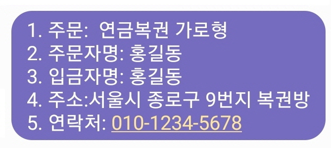 | ☞ 주문 제품명 (정확히 기재) ☞ 주문자명 ☞ 입금자명 ☞ 택배 받을 주소 (상호도 기재 요망) ☞ 연락처 |