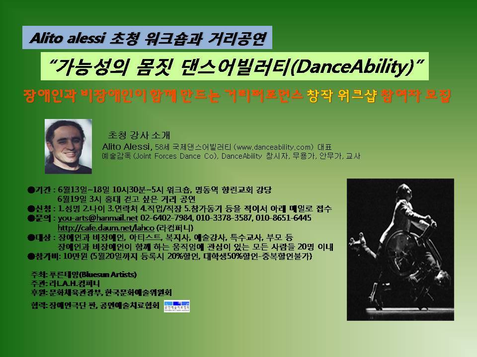 Alito alessi 초청 워크숍과 거리공연 “가능성의 몸짓 댄스어빌러티(DanceAbility) ” 작성자공연예술치료|작성시간11.05.08|조회수11 목록 댓글 0 글자크기 작게가 글자크기 크게가 * 문의 : you-arts@hanmail.net 02-6402-7984, 010-3378-3587, 010-8651-6445 http://cafe.daum.net/lahco (라컴퍼니) 다음검색 현재 게시글 추가 기능 열기 북마크 공유하기 신고 센터로 신고 댓글 댓글 0 댓글쓰기 답글쓰기 댓글 리스트