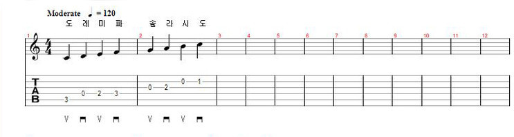 여기서 하나더 설명 해드릴께 있습니다. 타브악보에 보면 숫자들이 보이죠? 그건 프렛수를 말하는 겁니다.3이라고 표시되어 있으면 3프렛 0이라고 써있으면 개방현입니다. 계명을 읽어 볼까요? 도는 5번줄의 3프렛을 누루고 음을 냅니다.레는 4번줄의 개방현 상태에서 음을 냅니다. 미는 4번줄의 2프렛을 누루고 음을 냅니다.파는 4번줄의 3프렛을 누룬 상태에서 음을 냅니다. 이렇게 해서 쭉 치면 되는 겁니다.