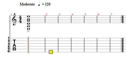 타브악보는 기타의 모양을 그대로 악보로 옮겨 놓은 것입니다. 다음 이미지에서 보면 위에 있는 그림은 일반적인 오선악보이고 TAB라고 표시되어 있는 악보가 타브악보입니다. 기타의 6현을 눕혀놓아 그대로 악보로 옮겨 놓았습니다. 지금 그림은 개방현(줄을 잡지 않은 상태)를 그림으로 표시 해드렸습니다. 위에 오선지 악보는 타브악보의 계명을 표시 해드린겁니다. 맨아랫줄이 "미"음 기타의 6번줄에 해당합니다.맨윗줄이 높은"미" 기타의 1번줄에 해당 하겠죠.