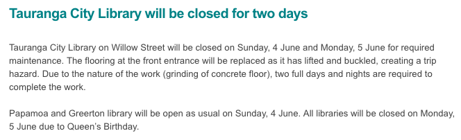 뉴질랜드 타우랑가 시티 도서관이 유지보수로 인해 6월4일부터 5일까지 문을 닫을 예정이라고 하네요.