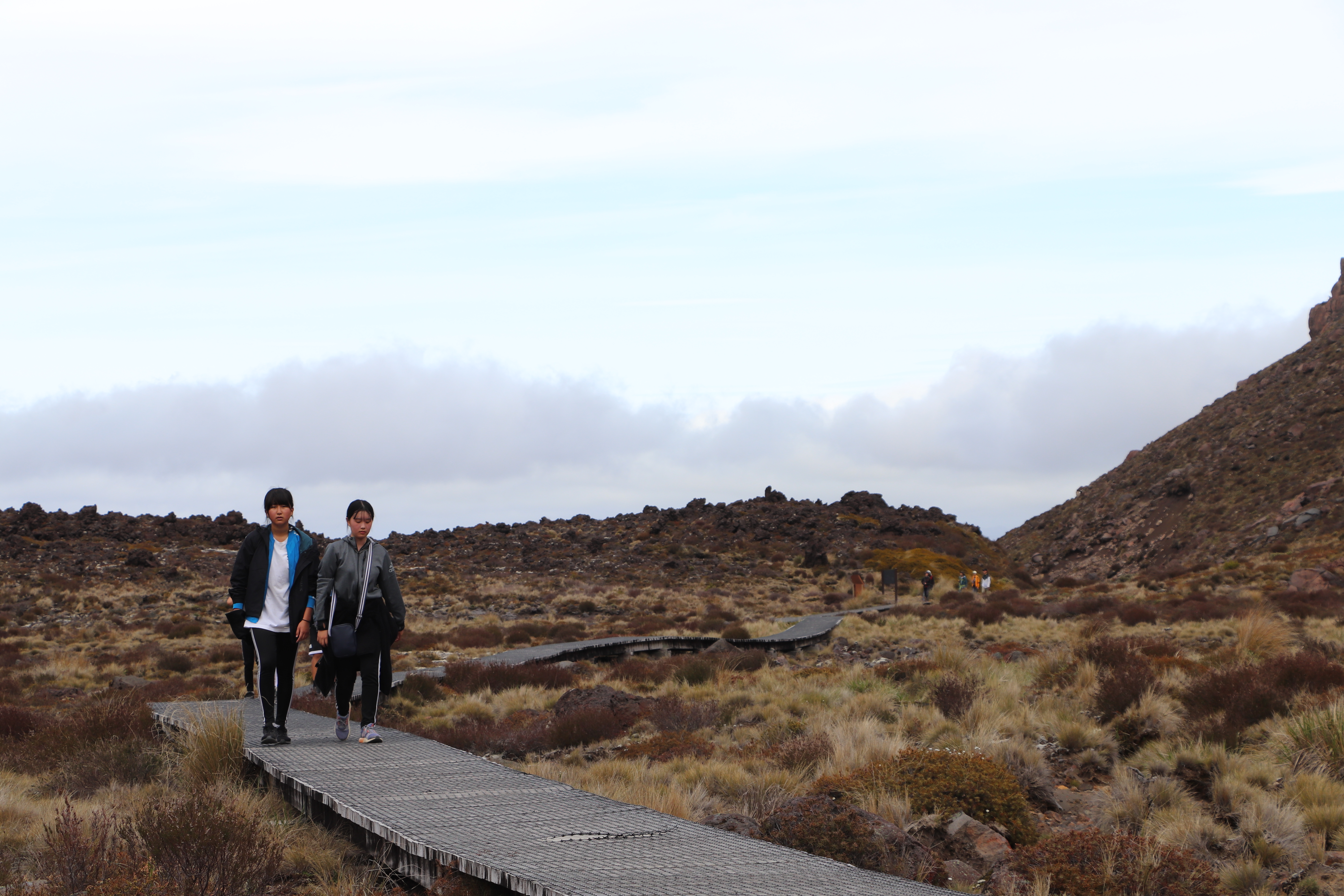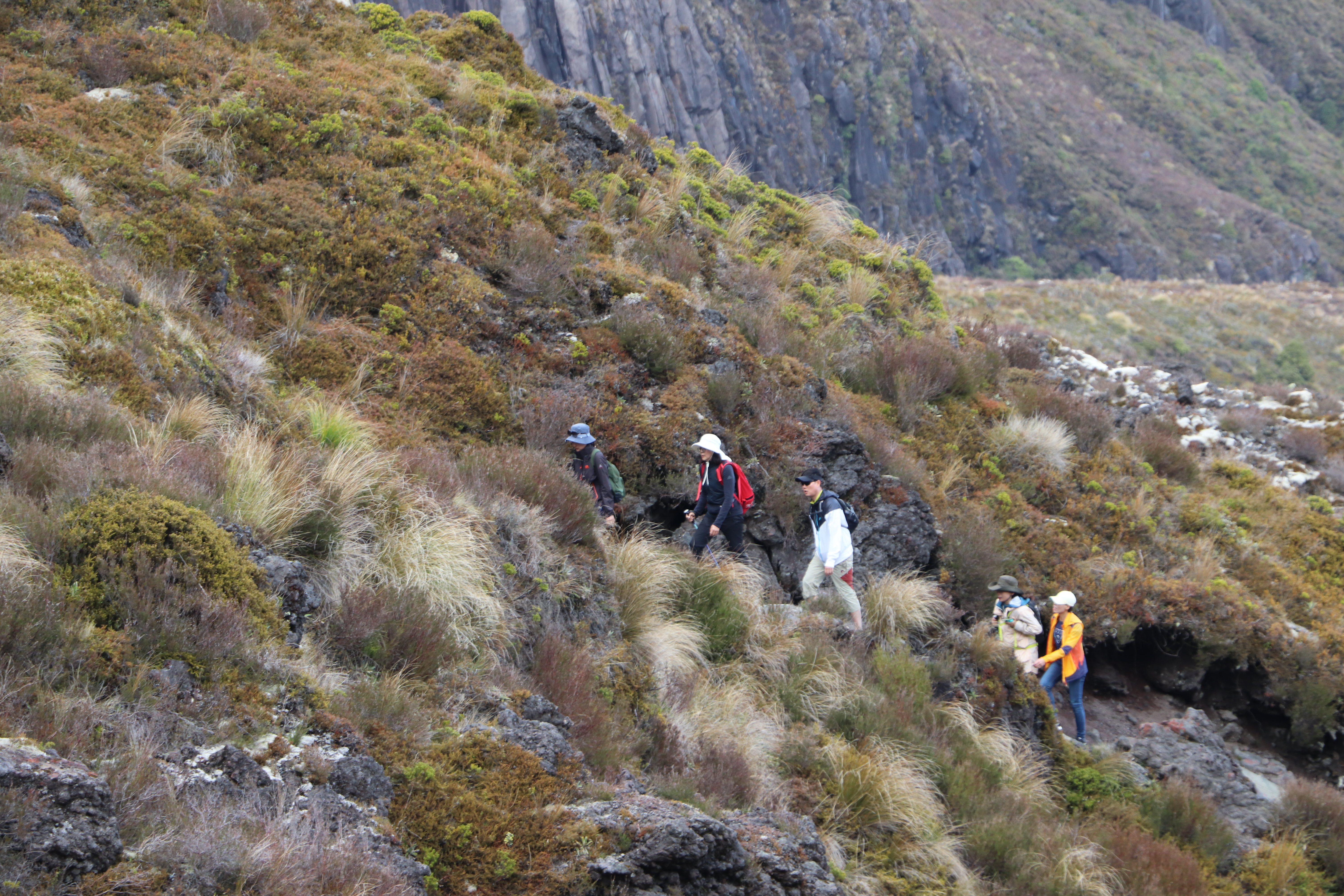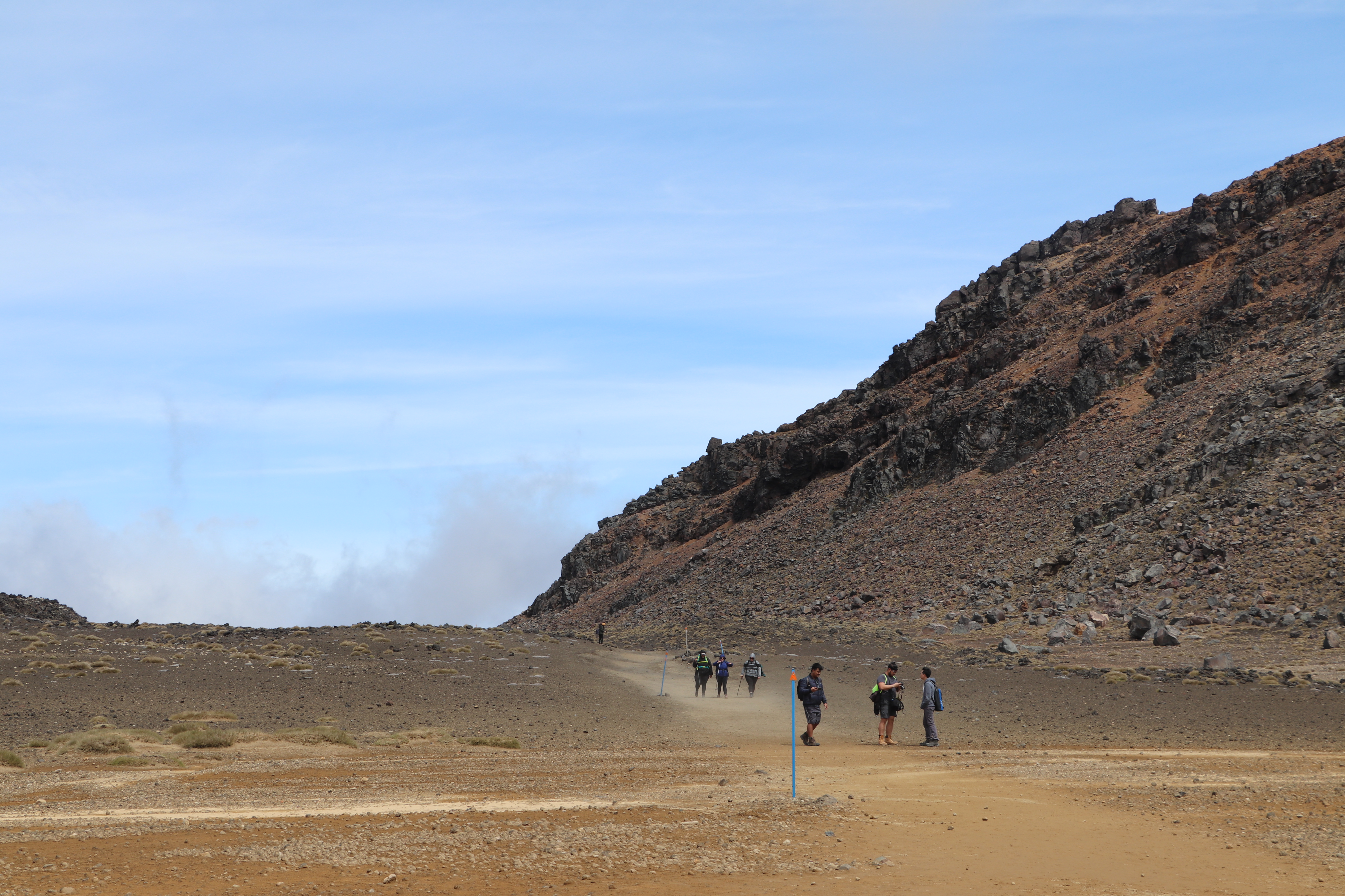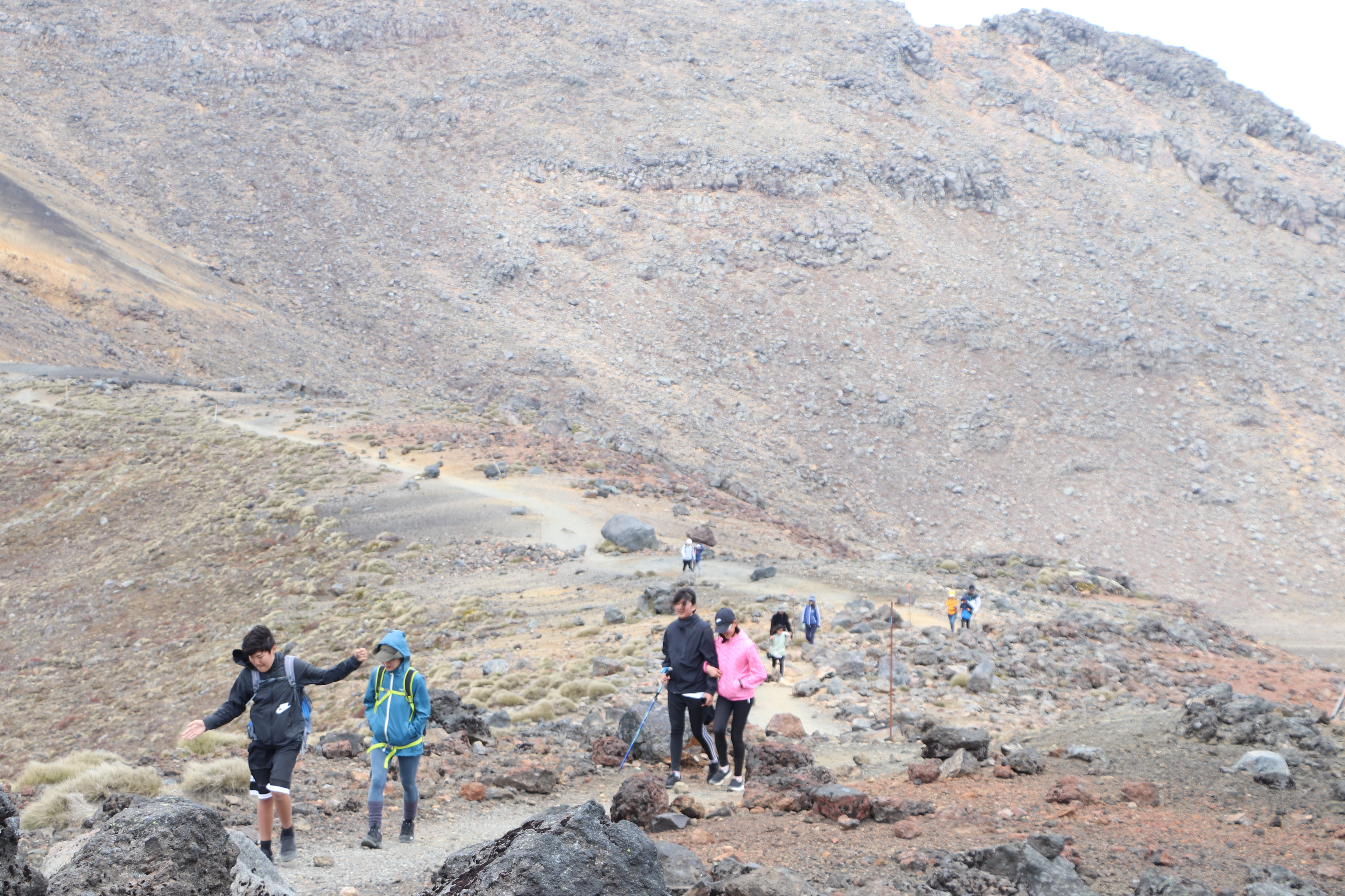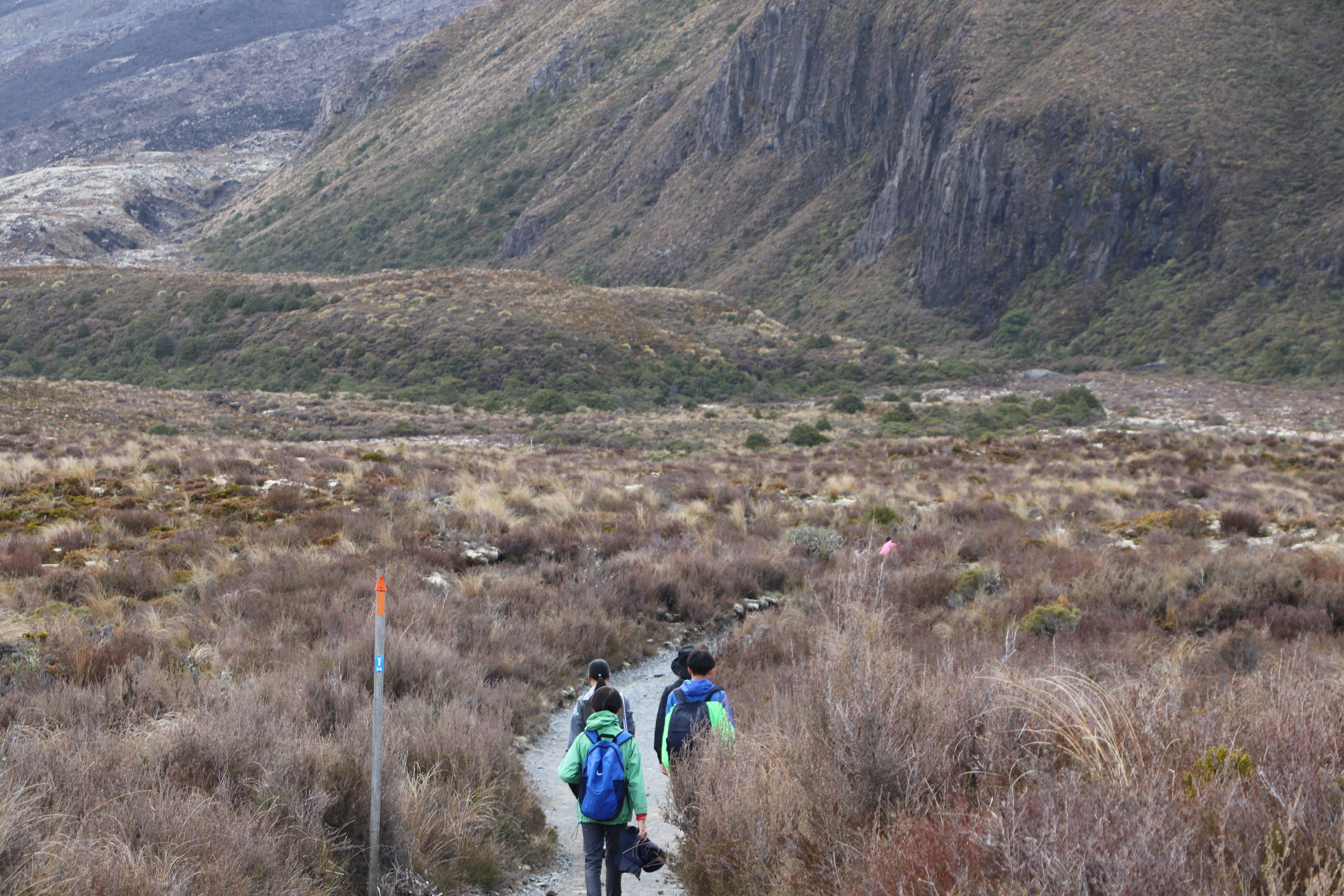 첫 1시간은 비교적 평지코스인데 정말 사람을 거의 못봤어요. 저희 팀만 있었고 저희 보다 먼저 출발한 키위들 후발대를 조금 지나치긴 했습니다. 통가리로 트래킹에 또 하나의 적은 바람인데 이 때까진 바람도 거의 없고 구름이 해를 가려 아주 편안하게 걸을 수 있었네요.