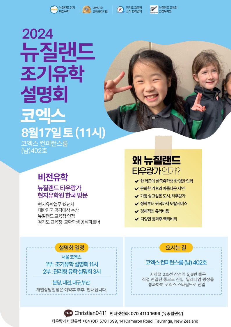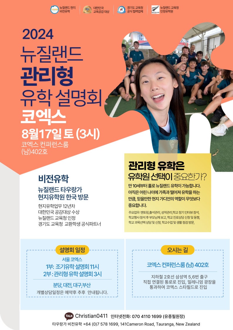 언제든 학교 및 유학의 전반에 관한 상담을 도와드리고 있으니 자세한 학교정보 필요하신 분들 비전 유학원으로 문의 주시기 바랍니다. 뉴질랜드 교육청이 인정하고 경기도 교육청 공식파트너인 비전유학에서 함께 해 드립니다.