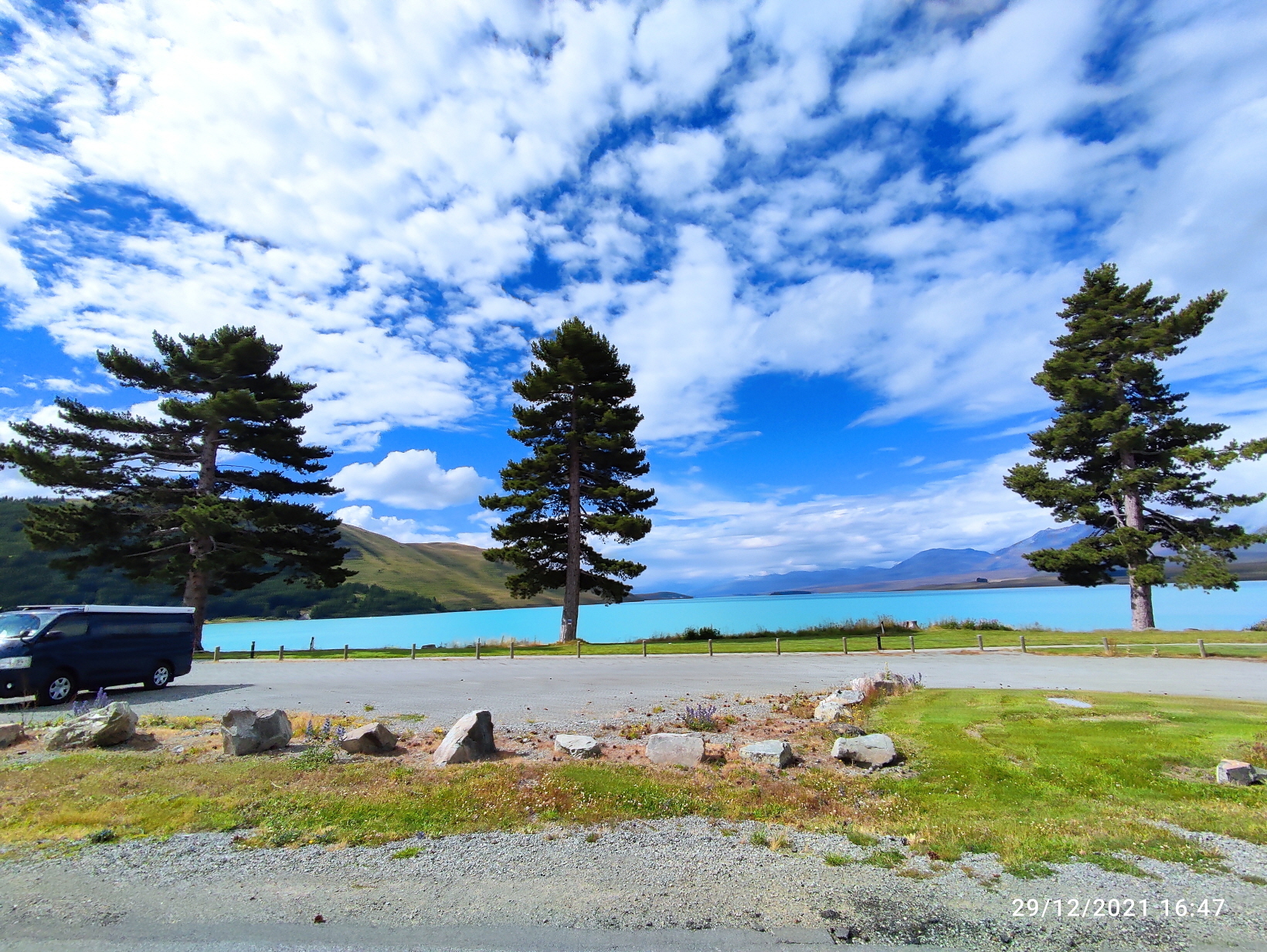 오늘 드디어 비가 멈췄습니다. 테카포 호수 도착전 7 ~ 8분 전에 그 파란 파스텔 색의 호수가 보이는 포인트가 있는데 정말 그때를 맞추어 비가 멈추고 구름이 걷히는 기적적인 상황이 연출되면서 테카포 호수에 입성하였습니다.