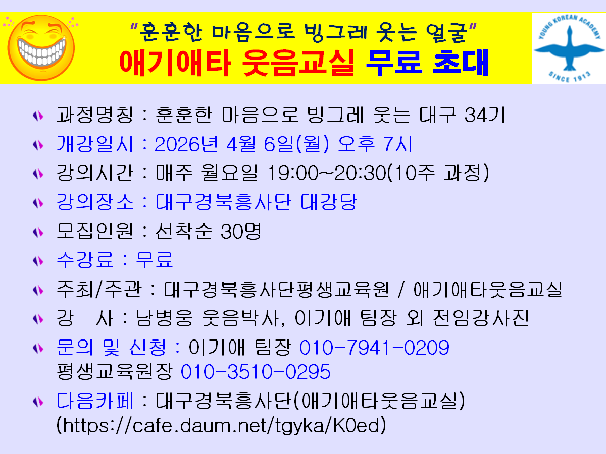 ●문의 및 신청 : 대구경북흥사단 웃음교실팀장 010 7941 0209, 평생교육원장 010-3510-0295