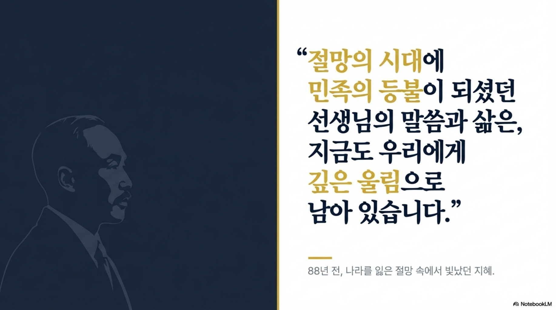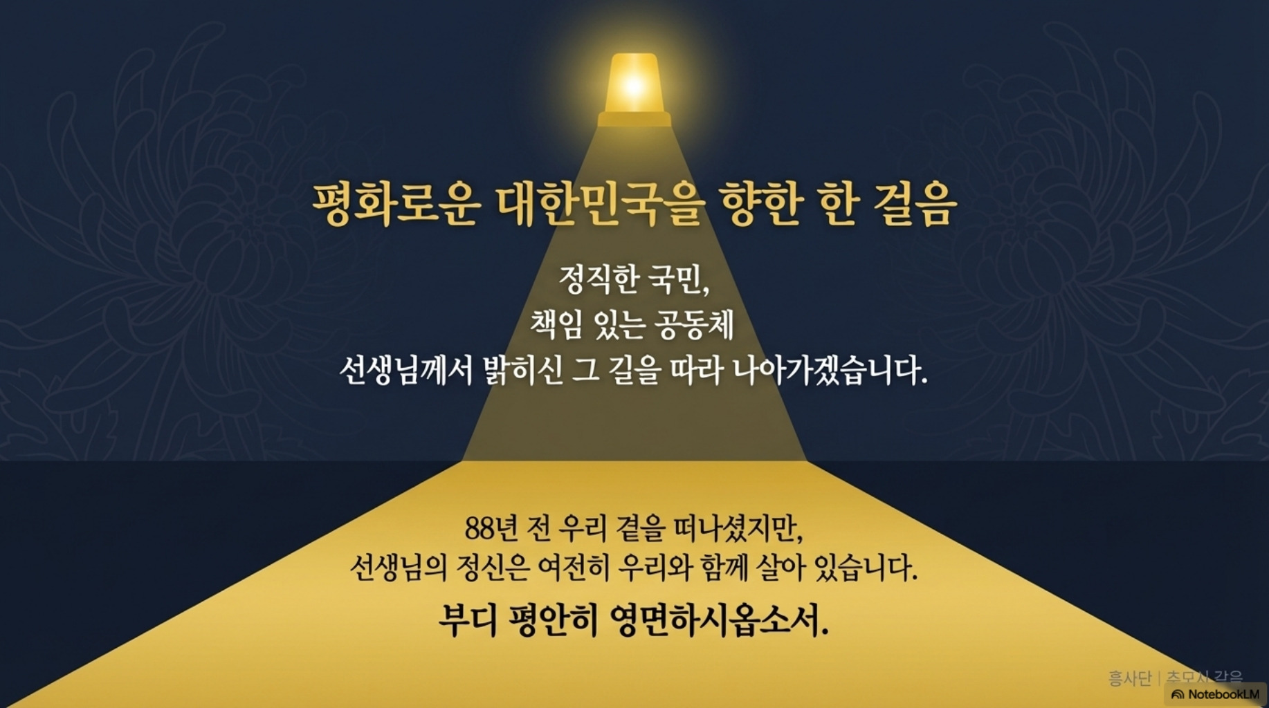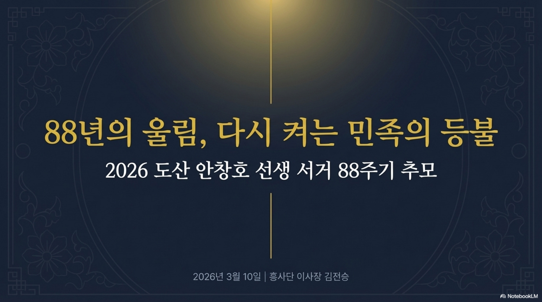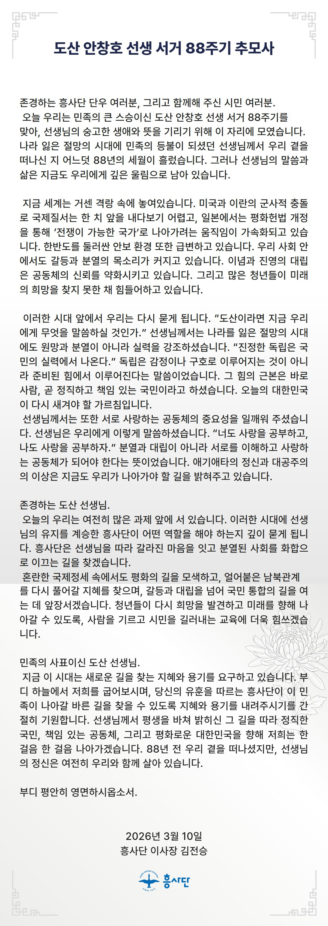 도산 안창호 선생 88주기 추모사 - 흥사단 김전승 이사장 작성자김상경(통상단우)|작성시간26.04.01|조회수9 목록 댓글 0 글자크기 작게가 글자크기 크게가 도산 안창호 선생 88주기 추모사 - 흥사단 김전승 이사장 명의의 추모사를 슬라이드로 만들었습니다. 다음검색 현재 게시글 추가 기능 열기 북마크 공유하기 신고 센터로 신고 댓글 댓글 0 댓글쓰기 답글쓰기 댓글 리스트