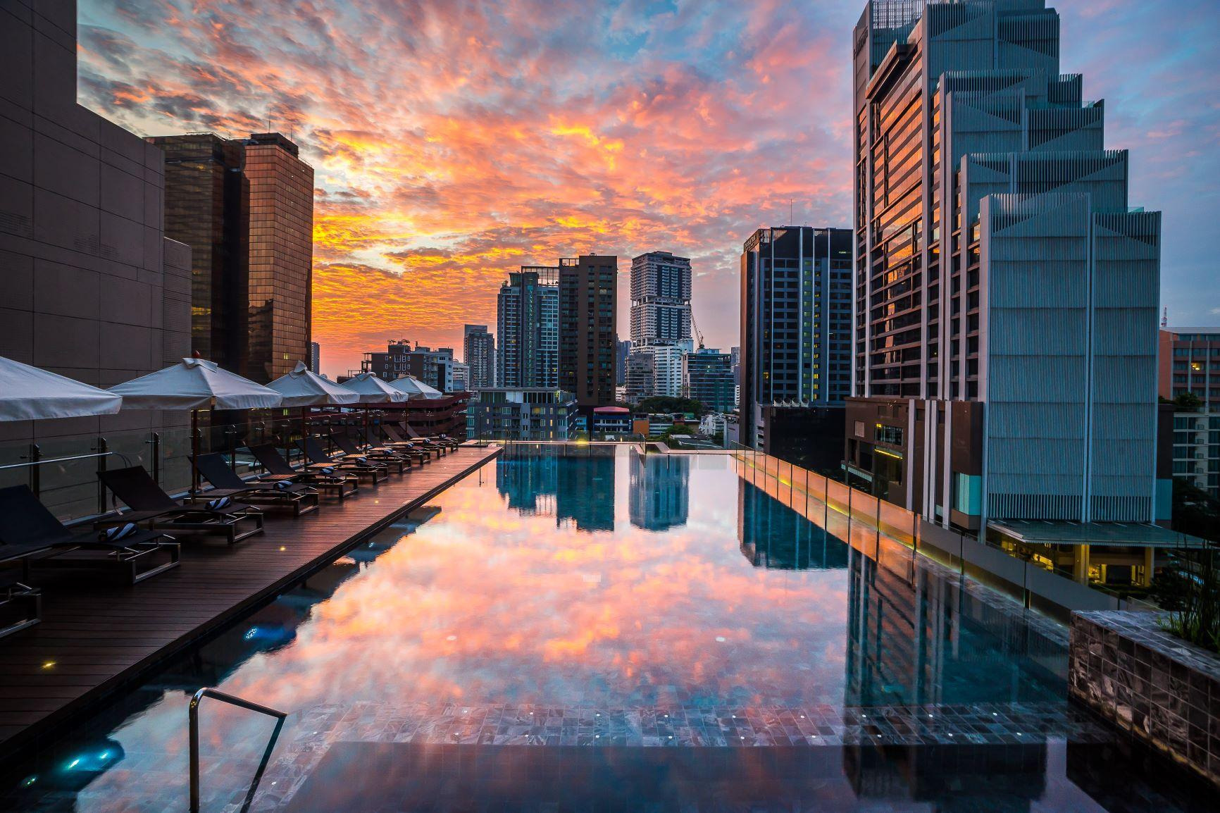스카이뷰 호텔 방콕은 방콕 중심가 수쿰빗소이 24에 위치한 5성급 호텔로 총객실수는 285개입니다. 스카이뷰 호텔 방콕은 2016년에 오픈한 호텔로 비교적 최근에 지은 호텔이므로 외관, 인테리어가 현대적입니다. 스카이뷰 호텔 방콕은 이름에서 알 수 있듯이 일몰 뷰가 아름다운 호텔입니다. 날씨좋은 날 수영장에서 바라보는 방콕 시티뷰는 잊을 수 없는 멋진 추억을 선사하기도 합니다.