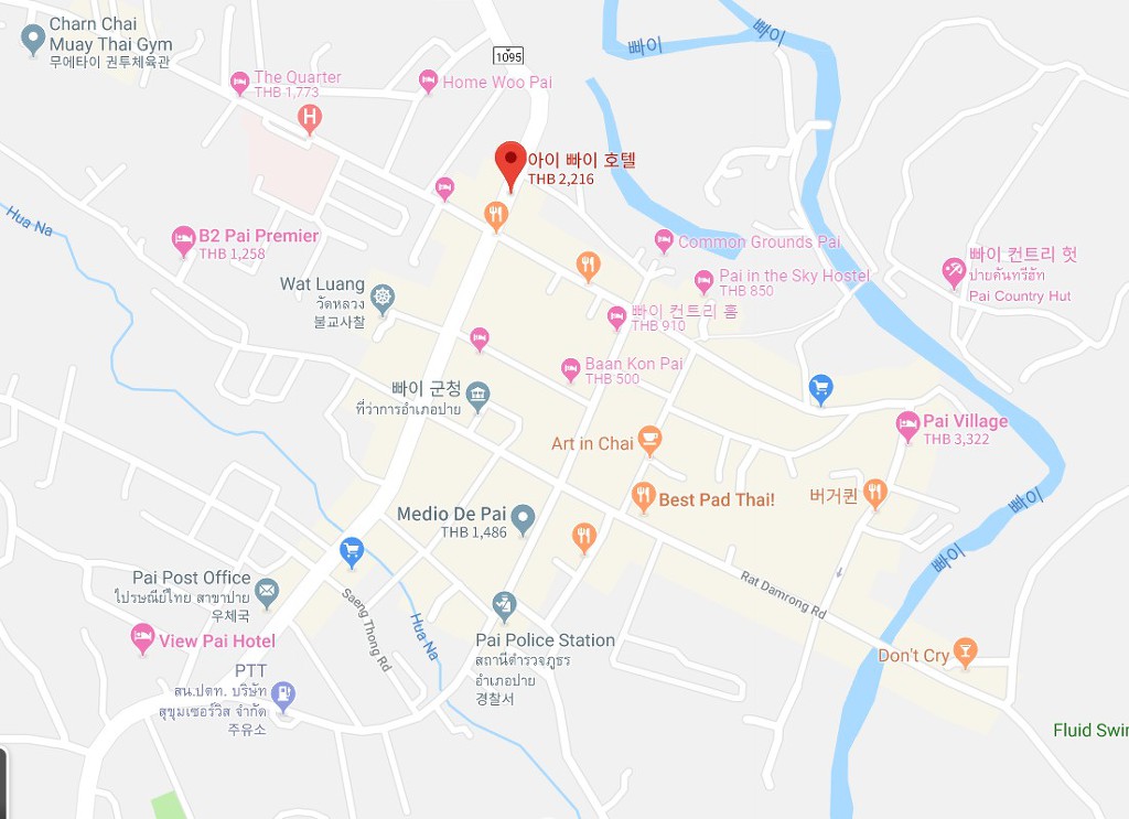아이빠이( AI Pai)호텔은 태국북부 예술가들의 마을이라 불리우는 빠이시내에 위치한 3성급 부띠크호텔로 총 객실수는 32개이다. 태국 북부 고대란나문화풍의 데크와 건축은 아이빠이의 특징으로 오랫동안 잊지 못한다. 작은 규모의 호텔이나 고급스러우면서 세심한 서비스로 고객들을 맞이하므로 만족도가 높은 호텔이다. 호텔인근에 빠이워킹스트릿이 위치해 로컬레스토랑,바,커피전문점,편의점,여행사등이 위치해 호텔 생활하기에 매우 편리하다.