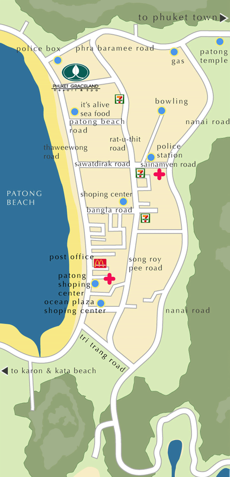 비교적 잘 되어 있어 가격대비 만족도가 높은 호텔중 하나이다. 호텔입구에서 비치가 도로로 이동하면 방라로드 유흥가가 가까우며, 비치가 반대도로인 세컨드 로드 즉 랏우팃 도로로 가면 오리엔타라 마사지샵등이 가까워 마사지 즐기기에 좋다.