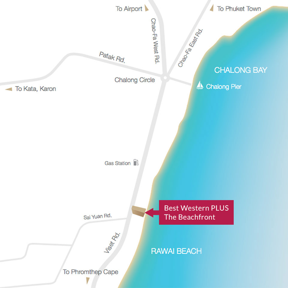 베스트웨스턴 플러스 더 비치 프론트 리조트는 푸켓최남단에 위치하나 주변에 가볼만한 곳이 몇 곳 있다. 라와이 시푸드마켓, 왓찰롱, 빌리지 마켓, 테스토로터스 할인점등이 있어 나름 장점이 있다. 산호섬,라차섬 가는 보트를 타는 찰롱선착장도 멀지 않아 섬투어를 고려할 경우 편리한 위치에 있다. 부대시설로 수영장, 키즈클럽,휘트니스센터, 비즈니스센터등을 갖추고 있다. 조용한 비치에서 편안한 휴식을 취하고자하는 여행객, 아동을 동반한 가족여행팀에 추천하기 좋다.