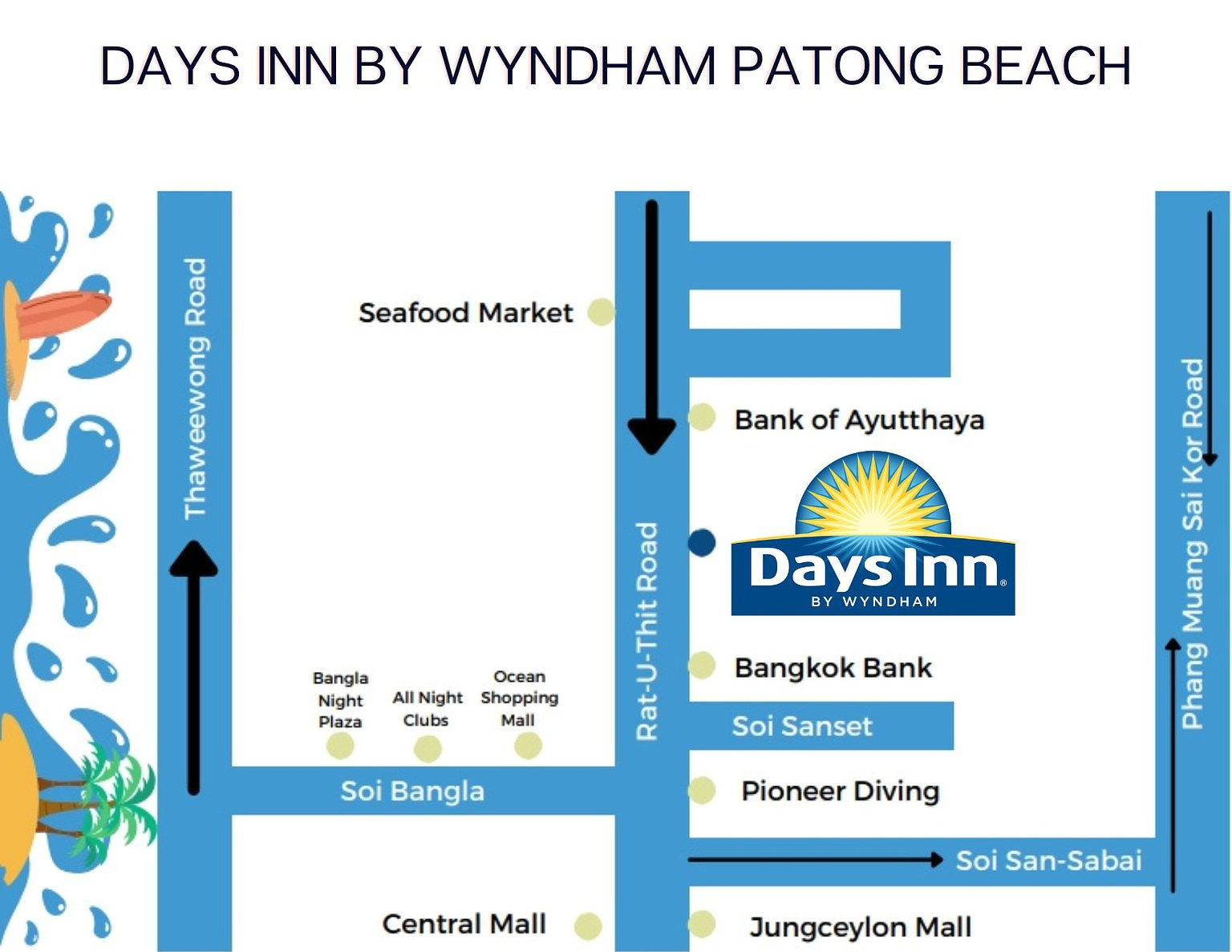 데이즈인 바이 윈담 파통호텔은 정실론쇼핑몰, 방라로드에서 도보로 5분 거리이며, 해변도 5~6분 거리입니다. 주변에는 세븐일레븐 편의점, 약국, 로컬레스토랑, 로컬마사지샵,약국, 세탁서비스샵등이 있어 호텔 생활하기에 매우 편리합니다. 호텔 입구 앞에는 공항, 프롬텝곶, 라와이비치로 가는 스마트버스가 있으며, 올드푸켓타운으로 가는 성테우 버스를 이용할 수 있어 올드타운 즐기기에 좋습니다.