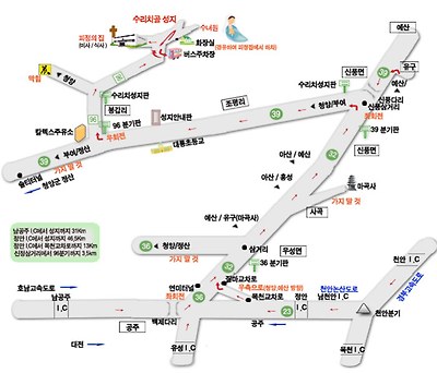- 대중교통을 이용하시는 경우 서울 방면 : 남부 터미널에서 유구행 버스 → 유구 하차 → 성지행(상갑리) 버스 대전 방면 : 유성 혹은 용두동 시외버스 터미널에서 예산 유구행 버스 → 신풍이나 유구에 서 하차 → 성지행(상갑리) 버스 유구에서 성지행 버스 출발 시간 : 09시 20분, 12시 40분, 15시 50분, 19시 30분 - 자가용을 이용하시는 경우 서울․강원․경기 → 천안 I.C → 논산고속도로 → 정안 I.C → 23 공주방향 → 32 청양ㆍ예산 방향 → 32 우성면 → 신풍면 → 39 청양 방향 → 96 봉갑리(상갑리 : 수리치골 성지) 서울․강원․경기 → 천안 I.C. → 1 대전 방향 → 21 온양 방향(남부 대로) → 39 공주 방향 → 39 유구․신풍 → 39 청양 방향 → 96 봉갑리(상갑리 : 수리치골 성지) 부산․대구․전주․광주 → 유성 I.C. → 32 공주 방향 → 32 예산 방향 →신풍면에서 39 청양 방향 → 96 봉갑리(상갑리 : 수리치골 성지) 인천 → 서해안 고속도로 서평택 I.C. → 38 아산 → 39 온양 → 39 공주 방향 → 39 유구․신풍 → 39 청양 방향 → 96 봉갑리(상갑리 : 수리치골 성지)