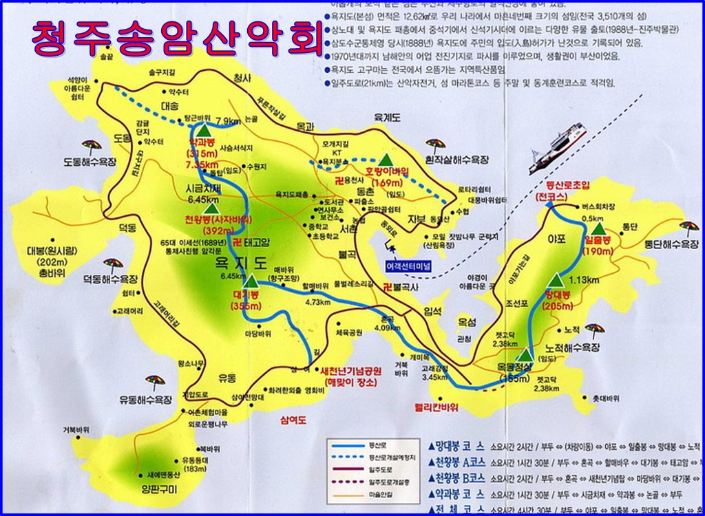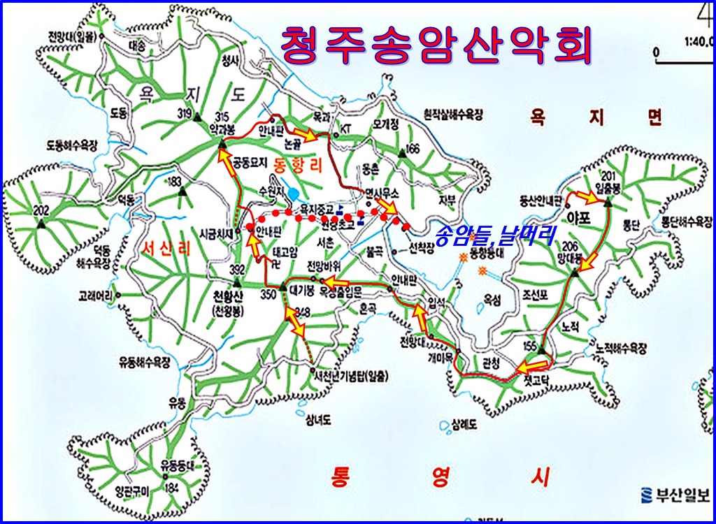 산행정보 | ★ 임원진 고 문 - 오 득 균 : 010-8845-3555 손 재 식 : 010-5469-4074 감 사 - 최 재 옥 : 010-2484-8580 회 장 - 정 태 희 : 010-5554-6979 부 회 장 - 김 학 수 : 010-5459-1107 남 자 총 무 - 임 문 혁 : 010-2820-3625(산행예약) 여 자 총 무 - 이 옥 순 : 010-8776-3660(산행예약) 산 악 대 장 - 김 태 영 : 010-5454-3405 수 송 대 장 - 유 인 호 : 010-4814-4478 ★ 난 이 도 : 중 ★ 산행시간 : 4:00 ★ 산행코스 : A코스 : 야포→(0.5km)→일출봉→(0.84km)→망대봉→(0.48km)→노적고개→ (0.6km)→젯고닥→(0.45km)→출렁다리→(0.8km)→고래강정→(1.m)→혼곡 (1.2km)→대기봉→(0.5km)→천왕봉→(2.7km)→약과봉→(2.8km)→선착장 B코스 : 자유트레킹. 욕지선착장4시30분출발,출발15분 전까지 선착장으로 오세요. |