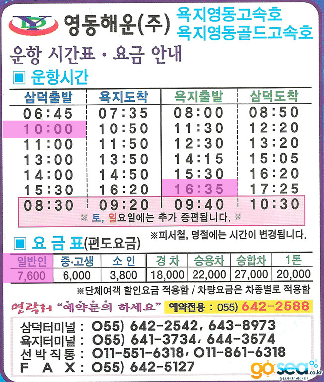☞ 06시00분 출발☜ 들어갈때:통영 삼덕항에서10시출항(9:30분부터승선). 나올때:욕지도항16:30분욕지항출항 ★실내체육관(광장)앞 아일투어 충북 70바 3141호 |