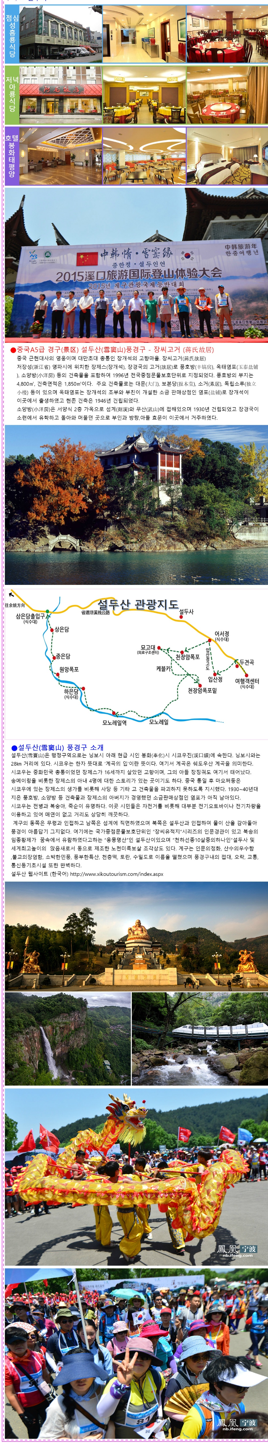 ★ 설두산(雪窦山) 풍경구 소개 ★ 설두산(雪竇山)은 행정구역으로는 닝보시 아래 현급 시인 봉화(奉化)시 시코우진(溪口鎭)에 속한다. 닝보시와는 28㎞ 거리에 있다. 시코우는 한자 뜻대로 ‘계곡의 입’이란 뜻이다. 여기서 계곡은 쉐도우산 계곡을 의미한다. 시코우는 중화민국 총통이었던 장제스가 16세까지 살았던 고향이며, 그의 아들 장징궈도 여기서 태어났다. 송메이링을 비롯한 장제스의 아내 4명에 대한 스토리가 있는 곳이기도 하다. 중국 통일 후 마오쩌둥은 시코우에 있는 장제스의 생가를 비롯해 사당 등 기타 고 건축물을 파괴하지 못하도록 지시했다. 1930~40년대 지은 풍호방, 소양방 등 건축물과 장제스의 아버지가 경영했던 소금판매상점인 염포가 아직 남아있다. 시코우는 전병과 복숭아, 죽순이 유명하다. 이곳 시민들은 자전거를 비롯해 대부분 전기오토바이나 전기차량을 이용하고 있어 매연이 없고 거리도 상당히 깨끗하다. 계구의 동쪽은 무령과 인접하고 남쪽은 섬계에 직면하였으며 북쪽은 설두산과 인접하여 물이 산을 감아돌아 풍경이 아름답기 그지없다. 여기에는 국가중점문물보호단위인 ”장씨유적지”시리즈의 인문경관이 있고 북송의 임종황제가 꿈속에서 유람하였다고하는 “응몽명산”인 설두산이있으며 “천하선종10살중의하나인”설두사 및 세계최고높이의 앉음새로서 동으로 제조한 노천미륵보살 조각상도 있다. 계구는 인문의정화, 산수의우수함 ,불교의장엄함, 소박한민풍, 풍부한특산, 천층떡, 토란, 수밀도로 이름을 떨쳤으며 풍경구내의 접대, 오락, 교통, 통신등기초시설 또한 완벽하다.