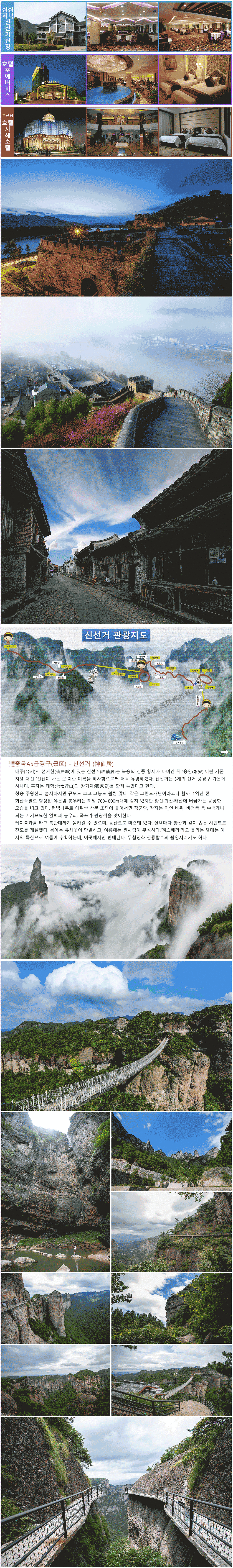 ★ 신선거(神仙居) 소개 ★ 태주(台州)시 선거현(仙居縣)에 있는 신선거(神仙居)는 북송의 진종 황제가 다녀간 뒤 ‘용안(永安)’이란 기존 지명 대신 ‘신선이 사는 곳’이란 이름을 하사함으로써 더욱 유명해졌다. 신선거는 5개??선거 풍경구 가운데 하나다. 혹자는 태항산(太行山)과 장가계(張家界)를 합쳐 놓았다고 한다. 청송 주왕산과 흡사하지만 규모도 크고 고봉도 훨씬 많다. 작은 그랜드캐년이라고나 할까. 1억년 전 화산폭발로 형성된 유문암 봉우리는 해발 700~800m대에 걸쳐 있지만 황산·화산·태산에 버금가는 웅장한 모습을 띠고 있다. 편백나무로 애워싼 산문 초입에 들어서면 장군암, 잠자는 미인 바위, 비천폭 등 수백개나 되는 기기묘묘한 암벽과 봉우리, 폭포가 관광객을 맞이한다. 케이블카를 타고 북관대까지 올라갈 수 있으며, 등산로도 마련돼 있다. 절벽마다 황산과 같이 좁은 시멘트로 잔도를 개설했다. 봄에는 유채꽃이 만발하고, 여름에는 원시림이 무성하다.‘웩스베리’라고 불리는 열매는 이 지역 특산으로 여름에 수확하는데, 이곳에서만 판매된다. 무협영화 천룡팔부의 촬영지이기도 하다. 신선거 웹사이트 www.zjxianju.com