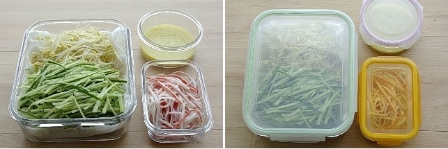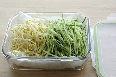 물기를 뺀 콩나물과 오이는 키친타월을 깐 유리용기에 담아둔다