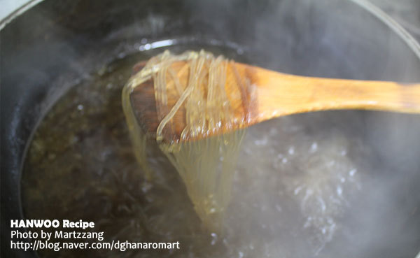 재료준비가 끝나면 끓는 물에 진간장3스푼, 식용유1스푼과 당면을 넣고
