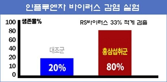 그 결과, 홍삼 투입군의 RS 바이러스 수치가 대조군(홍삼 미투입군)보다 무려 33%나 적은 것으로 확인되었습니다. 이에 강 교수는 "홍삼의 주요 성분이 바이러스를 없애는 세포를 활성화시키고 면역력을 끌어올렸다"고 설명하였습니다.