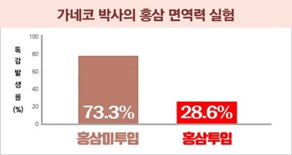 박사팀은 실험에 참가한 성인들에게 각각 홍삼과 가짜 약을 60일 동안 매일 섭취시켰습니다. 그러자 가짜 약 섭취 그룹은 73.3%나 독감에 걸렸지만, 홍삼 섭취 그룹의 발병률은 28.6%에 그쳤습니다. 이는 홍삼이 면역력 증진을 도와서 나타난 결과입니다.