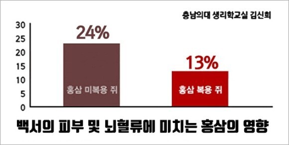 연구팀은 경동맥(뇌로 혈액을 전달하는 혈관)을 막아 뇌졸중을 유발시킨 쥐들을 두 그룹으로 나눈 뒤 한 쪽에만 홍삼 추출물을 투입했습니다. 그러자 대조 그룹의 뇌 혈류량은 24%나 줄어들었는데요. 홍삼 투입 그룹은 절반 수준인 13%만 감소하였습니다. 홍삼이 혈류량을 늘려 뇌졸중을 완화시킨 것입니다.